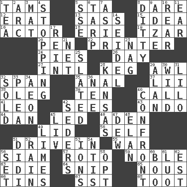 ACROSS 1. Scottish caps 5. R.R. building 8. Have the gumption 12. Part of Q.E.F. 13. Backtalk 15. The content of cognition 16. Thespian 18. 4th largest of the Great Lakes 19. Russian ruler 20. Fenced enclosure 22. Hard copy producer 24. Sliced desserts 26. 24 hours 27. International (abbr.) 28. Barrel 29. Leather borer 32. Connect, as a bridge 35. Of or related to the anus 37. Cards in a Roman deck? 38. Cassini of fashion 39. "___ Little Indians" 40. Give a ring to 41. Lion 42. Perceives with the eye 43. Southwest Nigerian state 44. One of the 12 tribes of Israel 45. Directed 46. Arabian gulf 49. Flaplike covering 50. Oneself 51. Popular '50s hangout 55. Armed conflict 56. Thailand, formerly 57. Printing process, for short 59. Impressive in appearance 63. Singer Brickell 64. Sever or remove by pinching or nipping 65. Common sense 66. Metal containers 67. Fast jet (abbr.) 68. A blast of a horn DOWN 1. Beverage made from leaves 2. Curve 3. Floor protector 4. Ceasing 5. Compass dir. 6. Canvas cover 7. SW Saudi Arabia district 8. Simple song 9. Edge tool used to cut and shape wood 10. Stern 11. Hearing organ 14. Beer mug 17. It's straight from the horse's mouth 21. Fish or hair follower 23. Tired old horse 25. Scheduled 28. Sunflower state 29. ____ Jay Lerner 30. Uncontrolled 31. _ and Stitch 32. Exchanged or delivered for money 33. Entreaty 34. Period of immesurable duration 36. Born 40. Meet 42. Spring feasts 45. 54 in ancient Rome 47. Morning condensation 48. Style 49. Citrus fruits 51. "You Light Up My Life" star Conn 52. Precipitation 53. Charged atoms 54. Nuclear Threat Initiatives 56. Put into a specified state 58. Elect 60. Sometimes accompanies a hiss 61. Nilotic language 62. Eastern Standard Time (abbr.)