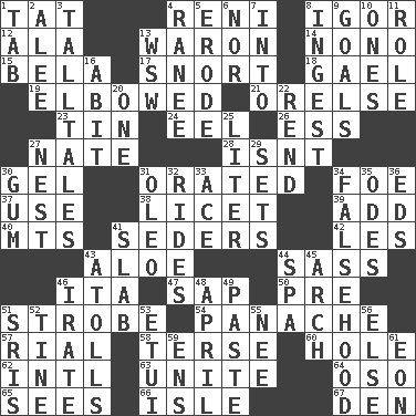 ACROSS 1. Make lace 4. Painter Guido (1575-1642) 8. Composer Stravinsky 12. Chicken ___ king 13. Make _____ (do battle with) 14. Words to Nanette 15. Actor Lugosi 17. Derisive sound 18. Highlander 19. Turned at an angle; bent 21. Threatening words 23. Metal container 24. Snakelike fish 26. Curvy letter 27. Nathan's nickname 28. Is not 30. Set 31. Declaimed 34. Enemy 37. Purpose 38. It is permitted: Lat. 39. Find the sum of 40. Mountains (abbr.) 41. Spring feasts 42. French article 43. _ vera 44. Backtalk 46. Call ___ day 47. Plant excrement 50. Before (prefix) 51. Disco prop 54. Flamboyance 57. Monetary unit of Yemen 58. Laconic 60. Hollow 62. International (abbr.) 63. Join together 64. Bear (Spanish) 65. Perceives with the eye 66. Capri or Wright 67. Lair DOWN 1. Bar bill 2. Toward shelter 3. Baron Munchausen's specialties 4. Indian princess (variant) 5. Wear away 6. Or not 7. To the inside or interior of 8. Eat 9. Purposes of endeavors 10. Singles 11. Hero or heavy, e.g. 13. Compass dir. 16. "This won't hurt ____!" 20. Single 22. Tear apart 25. 61 cubic inches 27. Egg locale 29. Arranges properly for use 30. Chewing product 31. Butter sub 32. Amusement-park features 33. Adept person 34. It jiggles the polygraph 35. Lyric poems 36. Begley and Asner 41. Thick slice 43. Ringlike coral islands and reefs 44. Health resort 45. Bowlike part 46. Feeling or showing extreme anger 48. Showery time 49. Thick mixture 51. Indian titles of respect 52. Prong on a fork 53. Needle case 55. Born 56. Otherwise 59. Followers of ems 61. Age