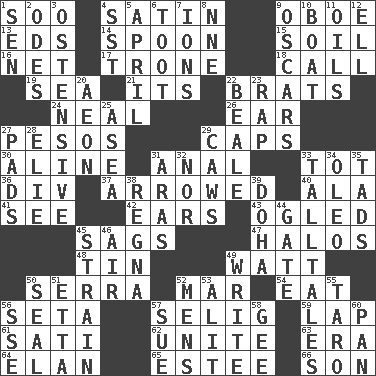ACROSS 1. "Barney Miller" actor Jack 4. Smooth fabric 9. Mitch Miller's instrument 13. Begley and Asner 14. Soup utensil 15. Land 16. Fish or hair follower 17. Heavy duty weighing machine 18. Give a ring to 19. Ocean 21. ___ a Wonderful Life 22. Naughty children 24. Be tempered by heat 26. Ewer handle 27. Mexican monetary units 29. Balmoral and tarboosh 30. Place in a line 31. Of or related to the anus 33. Small child 36. HTML Container Element 37. Moved like an arrow 40. Wing 41. Perceive with the eye 42. Hearing organs 43. Stared 45. Droops 47. Saint headwear 48. Metal container 49. Electrical Unit 50. Spanish missionary in California 52. Impair 54. Consume 56. Bristle 57. Major League Baseball Commissioner Bud 59. Pet locale 61. Suttee (variant) 62. Join together 63. Epoch 64. Style 65. First name in cosmetics 66. Boy, to dad DOWN 1. Elected rep. 2. Lyric poems 3. Clearly or manifestly demonstrative 4. Fast jet (abbr.) 5. Showery time 6. A blast of a horn 7. Charged atoms 8. Compass dir. 9. Motion picture awards 10. Water vessel 11. Petroleums 12. Pipe bend 20. A really long time 22. Calif. Air Force Base 23. Hit sharply and swiftly 25. At sea 27. Writing tablets 28. Writer Wiesel 29. Crow sounds 31. Caspian sea tributary 32. And not 33. Baron Munchausen's specialties 34. Margarine 35. Small amounts or degrees 38. Rain (Swedish) 39. Capital of the state of Qatar 44. Yard entry 45. Put through a sieve 46. Wind 49. Compose 50. Lick closed 51. Singer James 52. Not women's 53. Set down 55. Pacific island yam 56. Compass dir. 57. Take to court 58. Unit of force equal to gravity 60. Baking dish