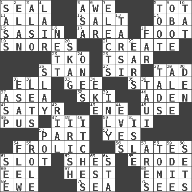 ACROSS 1. Lick closed 5. Deep reverence 8. Small child 11. Silent film actress Nazimova 12. Table seasoning 14. Chief or king in Benin or Nigeria 15. Indian antelope 17. Length times width 18. Pick up the tab 19. Sounds asleep 21. Cause to be 23. Ring climax 25. Russian ruler of old 26. Comedian Laurel of Laurel & Hardy 27. Title for a knight 28. Bit 31. Pipe bend 33. Turn to the right 35. Having lost freshness 37. Toward the sea 38. What Jean-Claude Killy likes to do 40. An important port of Yemen 41. Man with strong sexual desires 43. Compass dir. 45. Purpose 46. Suppuration 47. One more than two 50. 57 in ancient Rome 52. Component 53. It is so 54. Romp 56. Chalkboards 61. Position in a hierarchy or organization 62. "______ My Girl" (Turtles hit) 65. Wear away 66. Snakelike fish 67. Command 68. Give off 69. She-sheep 70. Ocean 71. Perceives with the eye DOWN 1. Backtalk 2. Enthusiasm 3. In addition 4. Den 5. White ___ sheet 6. Armed conflict 7. Chooses 8. A blast of a horn 9. Mitch Miller's instrument 10. Make lace 13. Tarsus (plural) 16. Remaining after all deductions 18. Distant 20. Heroin 22. Hearing organs 24. Washington bills 26. Kill 28. Small amounts or degrees 29. Toward shelter 30. Lair 31. Son of Isaac 32. Allows 34. Supplement with great effort 36. "Change" in Tahitian 37. Cleo's killer 39. In an inward manner 42. Monetary unit of Yemen 44. Nights before holidays 48. From or relating to Ireland 49. Skin irritations 51. Small island 52. Plant holder 54. Soared 55. Hero or heavy, e.g. 57. Ancient Greek god of war 58. Heavy book 59. Singer Brickell 60. Puts into a specified state 61. Perceive with the eye 63. Compass dir. 64. R.R. building