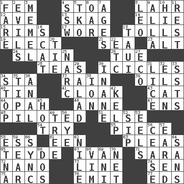 ACROSS 1. Opposite of masc. 4. Portico 8. Cowardly lion portrayer 12. "___ Maria" 13. Heroin 14. Writer Wiesel 15. Basketball hoops 17. Had on 18. For Whom the Bell _____ 19. Opt 21. Ocean 23. Keyboard modifier key 24. Killed 26. Third day of the wk. 28. Beverages made from leaves 30. Winter's stalactites 34. R.R. building 37. Precipitation 39. Petroleums 40. Metal container 41. Cover or conceal 43. Feline 44. Brightly colored fish 46. Singer Murray 47. Followers of ems 48. Manned the helm 51. Otherwise 54. Attempt to accomplish something 55. Component 58. Curvy letter 61. Car or cant ending 63. Entreaties 65. Miss Universe 1986, Barbara Palacios _ 67. _ the terrible 71. "Two Mules for Sister ____" 72. Billionth: prefix 73. Actor's bit 74. Elected rep. 75. Curves 76. Send forth 77. Begley and Asner DOWN 1. Conductor's collection 2. Vices 3. Klaipeda city 4. Compass dir. 5. Ring climax 6. Rowing implement 7. Eras 8. Lion 9. Silent film actress Nazimova 10. Land elevation 11. Remainder 16. Get outta here! 18. "Change" in Tahitian 20. Neckwear 22. And so on (abbr.) 25. Drug cop 27. Environmental prefix 29. First course 30. Silly 31. Louse (plural) 32. Enthusiasm 33. Fast planes 34. Obstruct or block passage 35. Native american tent (variation) 36. Of or related to the anus 38. Electrically charged atom 42. Seaweed 45. Being at a high temperature 49. Family _ (genealogy) 50. Sight organ 52. Small drink 53. Snakelike fish 56. Stop 57. Having ears or earlike features 58. Inactive volcano in Sicily 59. Singe 60. Synchronize (abbr.) 62. "Death on the ____" 64. Without 66. Two (Sp.) 68. Zeal 69. Cuckoo 70. Fish or hair follower