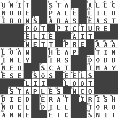 ACROSS 1. A single undivided whole 5. R.R. building 8. Actor Baldwin 12. Connecting point 13. Diluted with white 15. _ and Stitch 16. Metal shackles 18. Ancient river in northeast Turkey 19. 90 degrees 20. Plant holder 22. Photo 24. Writer Wiesel 26. Small island 27. Remaining after all deductions 28. Before (prefix) 29. American Automobile Association (abbr.) 32. Grant temporary use of 35. Pile 37. Shallow baking pan 38. In an inward manner 39. Big collection agency 40. Texas town _ City 41. Modern: prefix 42. Jazz singing style 43. "If ____ say so..." 44. Compass dir. 45. Mayday 46. Snakelike fish 49. Cards in a Roman deck? 50. Plunder 51. Paper fasteners 55. Non-commissioned officer (abbr.) 56. Passed on 57. Part of Q.E.F. 59. From or relating to Ireland 63. Christmas carol 64. Deli pickle 65. "Corrida" creature 66. Singer Murray 67. And so on (abbr.) 68. In a ____ (agitated or irritated) DOWN 1. University (slang) 2. Not either 3. Wedding promise 4. 3-inch nail 5. Health resort 6. Canvas cover 7. Jai ____ 8. Eskimo relative 9. One who doesn't tell the truth 10. Otherwise 11. Small bed 14. Fortification 17. Not divided or shared with others 21. Teat (slang) 23. Neckwear 25. Moral principles 28. Soft color 29. Tiny particle 30. Opera by Verdi 31. "60 Minutes" Commentator Rooney 32. Actor's bit 33. Washington bills 34. _ vera 36. Epoch 40. What propaganda does 42. Dirtied 45. Small drink 47. Age 48. Locales 49. Dipping utensil 51. The Jewish people; Israel 52. Adolescent 53. 4th largest of the Great Lakes 54. Table seasoning 56. Heredity factor (abbr.) 58. Affectionate concern, for short 60. Electrically charged atom 61. Indian title of respect (Mr.) 62. Being at a high temperature