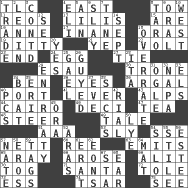 ACROSS 1. Affectionate concern, for short 4. Compass direction 8. Pull behind 11. Vintage cars 13. Ms. Damita and namesakes 15. "We ___ not amused" (Victoria) 16. Singer Murray 17. Empty; void 18. Mouths or openings 19. Short, simple song 21. Slangy assent 22. Electrical Unit 23. Conclusion 24. Oval reproductive body of a fowl 27. Make a knot 29. Son of Isaac 30. Heavy duty weighing machine 34. Benjamin's nick name 36. Sight organs 39. Therefore, facetiously 40. Left side of a ship or aircraft 41. Crowbar 43. High mountains 44. Capital of Egypt 46. Tenth: prefix 47. Afternoon social gathering 48. Navigate 49. Falsehood 51. Auto club (abbr.) 53. Playfully artful 54. Compass dir. 57. Remaining after all deductions 60. To sift 63. Gives off 65. Like ___ of sunshine 66. Came up 69. Came down and settled, as after flight 70. Coat; cloak 71. Before Barbara or Clara 72. Lacquered or enameled metalware 73. Double-curved letter 74. Russian ruler of old 75. Perceive with the eye DOWN 1. Swap 2. Soviet premier 1918-24 3. Continued (abbr.) 4. Connecticut Ivy Leaguer 5. The 18th letter of the Arabic alphabet 6. Kill 7. Prong on a fork 8. Edible starchy tuberous root 9. Of the mouth 10. 270 degrees 12. Put into a specified state 14. Back-to-school mo. 18. Make much ado about nothing 20. It is so 25. Highlander 26. Ridiculed 28. Call ___ day 29. Plea 31. Stare 32. California wine valley 33. Raised railways 34. Water vessel 35. One of the Great Lakes 37. Night before a holiday 38. Religious groups 40. Personal Computers (abbr.) 42. Monetary unit of Yemen 45. Mouth or opening 50. Sodium hydroxide 52. Caspian sea tributary 54. Grain storage towers 55. Vertical member of a panel or frame 56. First name in cosmetics 57. Nathan's nickname 58. Greek god of love 59. Labels 61. Part of Q.E.F. 62. Immeasurably long periods of time 64. Floor protector 67. R.R. building 68. Ewer handle