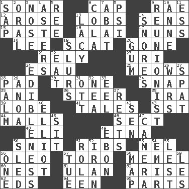 ACROSS 1. Underwater navigation system 6. Head covering 9. Actress Charlotte 12. Came up 13. Tennis shots 14. Elected reps. 15. Thick mixture 16. Jai _ 17. Religious women 18. Area sheltered from the wind 19. Scram! 20. Went 21. Have confidence or faith in 23. RI univ. 24. He sold his birthright 25. Catcalls? 28. Groovy apt. 30. Marketplace scale 34. Fastener 35. Black tropical American cuckoo 36. Navigate 38. Retirement account (abbr.) 39. Ear part 41. Falsehoods 43. Fast jet (abbr.) 44. Shopping centers 46. Religious group 48. Biblical high priest 49. Inactive volcano in Sicily 50. In a ____ (agitated or irritated) 51. Chest bones 53. Cartoonist voice _ Blanc 56. Margarine 57. "Corrida" creature 58. Klaipeda city 60. A home for chicks 61. ____ Bator 62. Get up 63. Begley and Asner 64. Car or cant ending 65. Pieces DOWN 1. Plant excrement 2. Taken by mouth 3. Characteristic smell of wine 4. Michaelmas daisies 5. To sift 6. Root beer relative 7. Blind as ____ 8. 23rd letter of the Greek alphabet 9. One who advocates reunion 10. Queen of England 1702-14 11. Double-curved letter 13. Made of lace 14. Sounds asleep 19. Runs notes together 20. Chewing product 22. Ingest 24. The property of being fit to eat 26. Armed conflicts 27. Argument over a trivial matter 28. Inside of hand 29. Small Philippine buffalo 31. Baseball player Mel 32. Teachers' org. 33. Snakelike fish 37. Musical pauses 40. American author Paul (1891-1958) 42. Elected rep. 45. Be seated 47. Device for capturing images 49. Inky black, to poets 50. Downhill vehicle 51. Hero or heavy, e.g. 52. SW Asia republic 54. Arab leader 55. For fear that 56. Single 57. Third day of the wk. 58. Atlas unit 59. French article