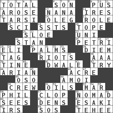 ACROSS 1. Add up to 6. Male child 9. Ichor 12. Came up 13. Grandmother 14. Angers 15. Tarsus (plural) 16. Cassini of fashion 17. Hero or heavy, e.g. 18. _-fi 19. Fast planes 20. Drink excessively 21. _ gin 23. Single; one (prefix) 24. Comedian Laurel of Laurel & Hardy 25. _ dish (used to culture cells) 28. Biblical high priest 30. Insides of hands 34. South Vietnam president (1954) 35. Label 36. Disturbances 38. American Automobile Association (abbr.) 39. Prong on a fork 41. A sleeping potion; an opiate (poet.) 43. Attempt 44. Believer in; advocate of (suffix) 46. Land measure 48. Bear (Spanish) 49. Mine, in Marseilles 50. Group working together 51. Lubricates 53. Make imperfect 56. Silvers or Donahue 57. Hoof sound 58. Wanderer 60. Perceives with the eye 61. Habitations of wild animals 62. 1973 Nobel Price Winner (Physics) Leo 63. Big collection agency 64. Distress signal 65. Giggle DOWN 1. Make lace 2. Mouths or openings 3. Torque (variant) 4. Aid 5. Flowery wreath 6. Table seasoning 7. Singles 8. Tired old horse 9. Conciliate 10. Ubangi River tributary 11. Compass dir. 13. Sense of smell 14. Pressed 19. Underwater navigation system 20. Uncastrated adult male sheep 22. Infant locale 24. Seigniories (variant) 26. Buttocks 27. "If ____ say so..." 28. Singer James 29. Den 31. Hat (slang) 32. Cut the grass 33. R.R. building 37. Shuts with force 40. Artist's stands 42. Environmental prefix 45. Immediately 47. Full of chinks, cracks, or crevices 49. High mountains 50. "Mermaids" star 51. Margarine 52. Charged atoms 54. Wet nurse 55. Immoral or dissolute person 56. Air pressure measure (abbr.) 57. Music discs 58. Fish or hair follower 59. Expire