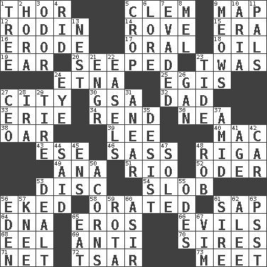 ACROSS 1. Son of Odin 5. Clement's nick name 9. Atlas unit 12. "The Thinker" sculptor 14. Be footloose 15. Epoch 16. Wear away 17. Relating to the mouth 18. Petroleum 19. Hearing organ 20. Oozed 23. It was, poetically 24. Inactive volcano in Sicily 25. Armor plate that protects the chest 27. Municipality 30. Girls' org. (abbr.) 32. Male parent 33. 4th largest of the Great Lakes 34. Tear apart 36. Teachers' org. 38. Rowing implement 39. Area sheltered from the wind 40. Apple computer (short form) 43. Compass dir. 46. Backtalk 48. Capital of Latvia 49. Santa ___, CA 51. _ de Janeiro 52. Baltic tributary 53. Flat circle 54. Messy guy 56. Made supply last 58. Declaimed 61. Plant excrement 64. Heredity factor (abbr.) 65. Greek god of love 66. Vices 68. Snakelike fish 69. Against 70. Founders of families 71. Fish or hair follower 72. Russian ruler of old 73. Confront DOWN 1. Relationship diagram 2. Israeli folk dance 3. Scent 4. To free from 5. Riding implement 6. Old wives' tales, e.g. 7. Eluded 8. Cartoonist voice _ Blanc 9. Catcalls? 10. Operatic vocal solo 11. Friends 13. Egg locale 21. Engineer (abbr.) 22. Artist's stands 23. Event that recurs at intervals 24. Sight organ 26. Separate the seeds from cotton 27. Corporate head (abbr.) 28. Lyricist Gershwin 29. Become fatigued 31. Approach 35. Stop 37. Among 41. Grow older 42. Auto 44. Alleged 45. Followers of ems 47. Not divided or shared with others 48. Director Reiner 50. Oak nuts 53. Started a card game 55. Lyric poems 56. Paradise 57. Leg joint 59. Round or rotation of duties 60. SW Saudi Arabia district 61. The founder of a family 62. Toward shelter 63. Inconspicuous attention getter 65. Consume 67. Zeal