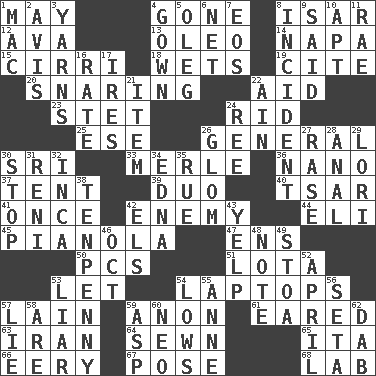 ACROSS 1. Can I? 4. Went 8. Austrian river, tributary to the Danube 12. Actress Gardner 13. Butter sub 14. California wine valley 15. High-altitude cloud 18. Soaks 19. Quote 20. Catching in a trap 22. Assist 23. Proofreading order 24. To free from 25. Compass dir. 26. Commissioned military rank 30. _ Lanka 33. Haggard of country music 36. Billionth: prefix 37. Portable shelter 39. Superhero pair 40. Russian ruler of old 41. Single time 42. Foe 44. Biblical high priest 45. Player piano 47. Followers of ems 50. Personal Computers (abbr.) 51. Globular water bottle used in Asia 53. Allow 54. Portable computers 57. (Had) reclined 59. Soon (poet.) 61. Having ears or earlike features 63. SW Asia republic 64. Stitched 65. Call ___ day 66. Suggestive of the supernatural 67. Introduce or present, as a question 68. Experiment locale DOWN 1. Big _ 2. Advice 3. Tall tales 4. Bride's dress 5. Cassini of fashion 6. Fish or hair follower 7. Greek goddess of the dawn 8. Event 9. Alleged 10. Fitting 11. Actress Charlotte 16. Pace 17. Angers 21. A whole individual unit 22. The 18th letter of the Arabic alphabet 24. To separate or throw off 26. Take by theft 27. Raze (variant) 28. Of or related to the anus 29. Australian parrot (variant) 30. Halt 31. Painter Guido (1575-1642) 32. South American Indian 34. Pulitzer Prize-winning author Ferber 35. Sorrow 38. 3-inch nail 42. Raised railways 43. Sharp bark 46. Sep. follower 48. Make mention of 49. Portico 52. Showery time 53. One who doesn't tell the truth 54. Moos 55. Queen of England 1702-14 56. Bristle 57. Whopper 58. "We ___ not amused" (Victoria) 59. Viper 60. Modern: prefix 62. Small moist lump or mass