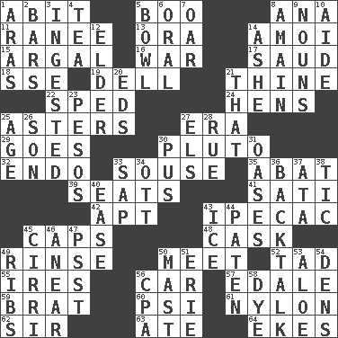 ACROSS 1. "This won't hurt ____!" 5. Oct. 31 cry 8. Santa ___, CA 11. The wife of a rajah (variant) 13. Mouth or opening 14. Mine, in Marseilles 15. Therefore, facetiously 16. Armed conflict 17. Saudi Arabian king (1953-1964) 18. Compass dir. 19. Small valley 21. One or ones belonging to thee 22. Broke a traffic law 24. Coop moms 25. Michaelmas daisies 27. Period 29. Moves 30. Cartoon dog 32. Inside; within (prefix) 33. Lush 35. Blind as ____ 39. Theater features 41. Suttee (variant) 42. Fitting 43. Medicinal drug used to evoke vomiting 45. Balmoral and tarboosh 48. Keg 49. Remove soap 50. Rendezvous 52. Bit 55. Angers 56. 4-wheeled motor vehicle 57. Peak District village in England 59. Naughty child 60. Air pressure measure (abbr.) 61. High-strength synthetic material 62. Title for a knight 63. Had dinner 64. Makes supply last DOWN 1. Caspian sea tributary 2. Soap units 3. Swallowed 4. Beverage made from leaves 5. Soup holder 6. Taken by mouth 7. Rowing implement 8. With great haste 9. Parts of speech 10. Helper 12. A person who is older than you are 14. American tennis player Robert 20. Begley and Asner 21. Not this but _ 23. Mexican monetary units 25. Ripen 26. Boy, to dad 27. Raised railways 28. Sorrow 30. Suppuration 31. Fertile tracts in a desert 33. Plant excrement 34. Baseball player Mel 36. Sass 37. _ moment's notice (2 wds.) 38. Nervous spasm 40. Relaxation 43. Frozen water 44. Eucharist need 45. High-altitude cloud 46. Approach 47. Inconspicuous attention getter 49. Teases 50. Vertical spar for supporting sails 51. 4th largest of the Great Lakes 53. Medicinal plant 54. Cub Scout units 56. Numbers guy (abbr.) 58. Color