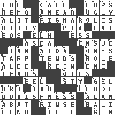 ACROSS 1. Definite Article 4. Give a ring to 8. Chops off 12. San ____ (Riviera town) 14. Approach 16. Repulsive 17. Set down 18. Frustrating wastes of time 20. Short, simple song 22. Parent Teacher Assoc. 23. Erode 24. Greek goddess of the dawn 25. Shade tree 28. Double-curved letter 30. At sea 31. Take place subsequently 35. Scottish cap 37. Portico 40. Washington bills 41. Canvas cover 42. Looks after 44. Hero or heavy, e.g. 45. Toward shelter 46. It's straight from the horse's mouth 47. She-sheep 48. Rends 50. Lubricates 52. Snakelike fish 54. Filthy place 55. Set 58. RI univ. 61. The 19th letter of the Greek alphabet 63. Dodge 65. Innocence, gentleness, or tenderness 70. ____ Jay Lerner 71. Blind as ____ 72. Remove soap 73. Indonesian resort city 74. Grant temporary use of 75. Wig 76. Commissioned military rank (abbr.) DOWN 1. Exchange 2. Sun: prefix 3. Sends forth 4. 4-wheeled motor vehicle 5. Black tropical American cuckoo 6. Part of a journey 7. Desk light 8. Nilotic language 9. Stare at amorously 10. Entreaty 11. System (abbr.) 13. Baseball player Mel 15. Pace 19. Raze (variant) 21. Affirmative reply 26. For fear that 27. Mother 29. Sounds asleep 30. Electrical Unit 32. Overwhelm 33. Ubangi River tributary 34. Compass dir. 35. Story 36. Type of rug 38. Single 39. Goodbye (Sp.) 41. Make lace 43. In a ____ (agitated or irritated) 49. Arranges properly for use 51. Sodium hydroxide 53. Cowardly lion portrayer 55. POW camp 56. Peak District village in England 57. Soviet premier 1918-24 58. Hereditary estate 59. Loose flowing garment 60. "Terrible" tsar 62. A single undivided whole 64. Experiment locale 66. It would 67. Compass dir. 68. Fast jet (abbr.) 69. Observe