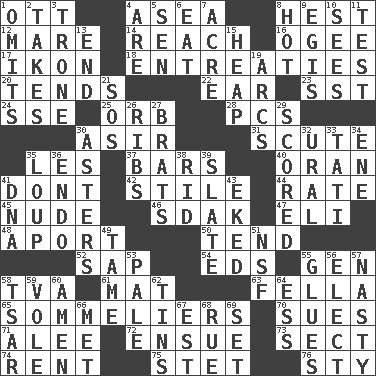 ACROSS 1. Baseball player Mel 4. At sea 8. Command 12. Female horse 14. Arrive at 16. Double curve, resembling the letter S 17. Picture 18. Pleas 20. Is inclined (to) 22. Hearing organ 23. Fast jet (abbr.) 24. Compass dir. 25. Globe 28. Personal Computers (abbr.) 30. SW Saudi Arabia district 31. Turtle shell scale 35. French article 37. Long, evenly shaped pieces 40. Northwest Algerian city 41. Do not 42. Vertical member of a panel or frame 44. Pace 45. Unadorned 46. Neighbor of Neb. 47. Connecticut Ivy Leaguer 48. To the left, to Queeg 50. Be inclined (to) 52. Plant excrement 54. Begley and Asner 55. Commissioned military rank (abbr.) 58. Federal power corp. 61. Floor protector 63. Chap (slang) 65. Wine waiters 70. Institutes legal proceedings 71. Toward shelter 72. Take place subsequently 73. Religious group 74. Monthly bill 75. Proofreading order 76. Filthy place DOWN 1. Leaves out 2. Receives possession of 3. Marketplace scale 4. "We ___ not amused" (Victoria) 5. Elected rep. 6. Consume 7. Land measure 8. Being at a high temperature 9. The front part of a cuirass 10. Perceives with the eye 11. Trial 13. Conclusion 15. Pile 19. Arches 21. Mayday 26. Chest bones 27. Naughty children 29. Tallied 30. Michaelmas daisies 32. Mountain range 33. Jacques of French films 34. Compass dir. 35. Central Nebraska county 36. Inside; within (prefix) 38. To free from 39. Chalkboard 41. Heredity factor (abbr.) 43. Made supply last 49. Not wild 51. Science/research agcy. 53. Light colored 55. Cements 56. Choose 57. Difficult 58. Russian ruler of old 59. Grand slam 60. So be it 62. Canisters 64. Curvy letter 66. Was introduced to 67. Eastern Standard Time (abbr.) 68. Regret 69. Arrange properly for use