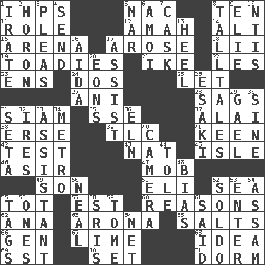 ACROSS 1. Naughty children 5. Big _ 8. Nine, plus one 11. Hero or heavy, e.g. 12. Housemaid 14. Keyboard modifier key 15. Sports stadium 17. Came up 18. Cards in a Roman deck? 19. Sycophants 21. Eisenhower's nickname 22. French article 23. Followers of ems 24. Two (Sp.) 25. Allow 27. Black tropical American cuckoo 28. Sinks 31. Thailand, formerly 35. Compass dir. 37. Jai _ 38. Celtic language 39. Affectionate concern, for short 41. Peachy ____! 42. Trial 43. Floor protector 45. Capri or Wright 46. SW Saudi Arabia district 47. Crowd into 49. Male offspring 51. Connecticut Ivy Leaguer 52. Ocean 55. Small child 57. Eastern Standard Time (abbr.) 60. Thinks logically 62. Santa ___, CA 63. Scent 65. Table seasonings 66. Commissioned military rank (abbr.) 67. Welles in "The Third Man" 68. It may be bright or harebrained 69. Fast jet (abbr.) 70. Arrange properly for use 71. Dormintory (informal) DOWN 1. Feeling or showing extreme anger 2. Person of subnormal intelligence 3. Entreaties 4. Transmit 5. Make imperfect 6. Mine, in Marseilles 7. Keg 8. Baron Munchausen's specialties 9. Writer Wiesel 10. Nuclear Threat Initiatives 13. Person who is morally reprehensible 16. Opera by Verdi 17. Help 20. Immeasurably long periods of time 26. 1973 Nobel Price Winner (Physics) Leo 29. Highlander 30. Trig term 31. Bristle 32. Angers 33. Aide 34. Paris' subway 36. Shade tree 40. Device for capturing images 44. Lacquered or enameled metalware 48. Prejudice 50. Anneal 52. Twentieth part of a lira 53. Keyboard key 54. Indian state 55. Labels 56. Washington bills 58. Indian titles of respect 59. Heavy book 61. Expressed in words 64. Was introduced to
