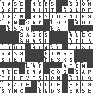 ACROSS 1. To erase 5. Disorderly crowds 9. The Jewish people; Israel 13. Double curve, resembling the letter S 14. Set down 15. Message 16. NW Algerian seaport 17. Homes 19. "___ Little Indians" 20. E Mali city 21. Trim (branches) 22. Nonscientific branch of learning 23. Son of Isaac 25. Erode 26. Gurus 30. Actor Baldwin 34. Box-office sellout 35. Actor Lugosi 36. Needle case 39. Break or tear apart 42. For fear that 43. Backtalk 44. Remove soap 46. Proofreading order 47. Writing tables 48. Pet locale 51. Tiny particle 54. Born 57. _ tizzy (2 wds.) 58. Gear tooth 60. Plant excrement 62. Household entertainment appliance 65. Grain storage tower 66. Feeling or showing extreme anger 67. Lacquered or enameled metalware 68. Snakelike fish 69. Synchronize (abbr.) 70. Conclusions 71. Celtic language DOWN 1. Carrot, for example 2. Match 3. Seines 4. Car or cant ending 5. Hindu Mythology: god of death 6. Butter sub 7. Altar cloth linen 8. Vertical member of a panel or frame 9. Manchild 10. South American Indian 11. Baltic tributary 12. Egg locale 15. Back-to-school mo. 18. ___ good deed 20. Island territory of the United States 24. Help 27. Slender fish 28. Compass dir. 29. Broken piece 30. Most capable 31. Area sheltered from the wind 32. Raised railways 33. Feline 36. Curvy letter 37. Make lace 38. Purpose 40. Compete 41. Followers of ems 45. Heroin 48. Moving, as bait 49. Cuckoo 50. Thick mixture 52. Flexible twig of a willow tree 53. Promenades 54. Nuclear Threat Initiatives 55. Suggestive of the supernatural 56. Liveliness 58. Lacking warmth 59. Washington bills 61. Airs 63. And so on (abbr.) 64. Electrically charged atom 65. Observe