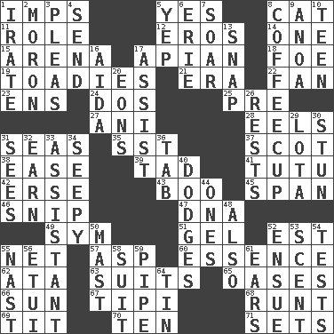 ACROSS 1. Naughty children 5. It is so 8. Domesticated feline 11. Hero or heavy, e.g. 12. Greek god of love 14. Single 15. Sports stadium 17. Bee-related 18. Enemy 19. Sycophants 21. Epoch 22. Avid follower 23. Followers of ems 24. Two (Sp.) 25. Before (prefix) 27. Black tropical American cuckoo 28. Snakelike fish 31. Oceans 35. Fast jet (abbr.) 37. Highlander 38. Relaxation 39. Small boy 41. Ballerina skirt 42. Celtic language 43. Surprise greeting 45. Connect, as a bridge 46. Sever or remove by pinching or nipping 47. Heredity factor (abbr.) 49. Symbol (abbr.) 51. Set 52. Eastern Standard Time (abbr.) 55. Fish or hair follower 57. Viper 60. Substance 62. "One Day ___ Time" 63. Costumes for special activities 65. Fertile tracts in a desert 66. Player for Phoenix 67. Native american tent (variation) 68. Undersized animal 69. Teat (slang) 70. "___ Little Indians" 71. Arranges properly for use DOWN 1. Feeling or showing extreme anger 2. Person of subnormal intelligence 3. Entreaties 4. Post 5. Slangy assent 6. One of the Great Lakes 7. Fly high 8. Java holder (2 wds.) 9. Small Philippine buffalo 10. Adolescent 13. Fastener 16. Opera by Verdi 17. Help 20. Immeasurably long periods of time 26. Musical pauses 29. Globular water bottle used in Asia 30. Surprise greatly 31. Perceives with the eye 32. Merit 33. Aide 34. Oozy 36. Keyboard key 40. Evades 44. Washington bills 48. In addition 50. Vertical spar for supporting sails 52. Follow as a consequence or result 53. Aroma 54. Trials 55. Political cartoonist Thomas 56. Needle case 58. Set or collection 59. Corncob 61. Hearing organs 64. Metal container