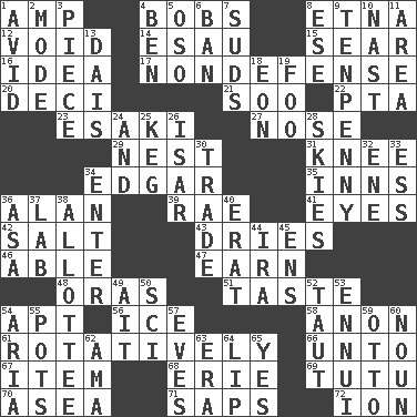 ACROSS 1. Electrical Unit 4. Moves up and down 8. Inactive volcano in Sicily 12. Lacking any legal or binding force 14. Son of Isaac 15. Singe 16. It may be bright or harebrained 17. Unrelated to defense, as in spending 20. Tenth: prefix 21. "Barney Miller" actor Jack 22. Parent Teacher Association (abbr.) 23. 1973 Nobel Price Winner (Physics) Leo 27. Sense of smell 29. Egg locale 31. Leg joint 34. _ Allan Poe 35. Lodging establishments 36. Actor Alda or Thicke 39. Actress Charlotte 41. Snake ____ (dice throw) 42. Table seasoning 43. Frees from moisture 46. Competent 47. Merit 48. Mouths or openings 51. Clothes sense 54. Fitting 56. Frozen water 58. Soon (poet.) 61. Producing rotation 66. To (old English) 67. A distinct part 68. One of the Great Lakes 69. Ballerina skirt 70. At sea 71. Plant excrements 72. Electrically charged atom DOWN 1. Enthusiastic 2. Method 3. Component 4. Benjamin's nick name 5. Bear (Spanish) 6. Prohibit 7. Beer foam 8. Compass dir. 9. 3-inch nail 10. Political cartoonist Thomas 11. Type of rug 13. Raised platform 18. Period of immesurable duration 19. Egg _ yung 24. Plus 25. Cask 26. Austrian river, tributary to the Danube 28. Atmospheres 30. Buy and sell 32. Compass dir. 33. Double-curved letter 34. Keyboard key 36. White ___ sheet 37. Experiment locale 38. One to whom something is allotted 40. Part of Q.E.F. 44. Lyricist Gershwin 45. Followers of ems 49. Small island 50. _-fi 52. Drawn tight 53. World-weariness 54. Operatic vocal solo 55. Cooking vessels 57. Nights before holidays 59. Von Bismarck 60. Part of speech 62. Nursemaid (var.) 63. Period 64. Mouth edge 65. Consenting reply