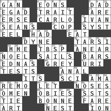 ACROSS 1. Separate the seeds from cotton 4. Immeasurably long periods of time 8. Male parent 11. Mild oath 13. Distinguishing feature 15. "We ___ not amused" (Victoria) 16. Celtic language 17. Monte _, Las Vegas Hotel/Casino 18. "Terrible" tsar 19. Actors Connery and Penn 21. Police officer (slang) 22. System (abbr.) 23. Snakelike fish 24. Possessed 27. Ingest 29. Unit of force 30. Tarsus (plural) 34. Madame (abbr.) 36. Cook's measure (abbr.) 39. Approach 40. Christmas carol 41. Moves on water 43. Soap units 44. Ferber et al. 46. Jennifer or Joel 47. RI univ. 48. Trials 49. Of or related to the anus 51. ___ a Wonderful Life 53. _-fi 54. Wet nurse (var.) 57. San ____ (Riviera town) 60. Allow 63. Olfactory organs 65. Presage 66. Off-Broadway awards 69. Fast planes 70. Standoff 71. Maid-servant 72. Conductor's collection 73. Nonscientific branch of learning 74. Egg locale 75. Electrically charged atom DOWN 1. Honkers 2. Match 3. Relating to the nose 4. And so on (abbr.) 5. Mouth or opening 6. Drug cop 7. Grain storage tower 8. American folk hero Crockett 9. Ancient river in northeast Turkey 10. Gouge 12. Lair 14. Drink excessively 18. Byzantium, centuries later 20. Like a shrinking violet 25. Pismires 26. Debunk (Brit. slang) 28. _ moment's notice (2 wds.) 29. Conveyance 31. Tail end 32. Indian skirt 33. Big collection agency 34. Method 35. Not women's 37. Title for a knight 38. Entreaties 40. Fish or hair follower 42. Synchronize (abbr.) 45. Fast jet (abbr.) 50. The 18th letter of the Arabic alphabet 52. Oscar Madison type 54. Slender Brazilian palm 55. Paris' subway 56. NE Netherlands city 57. Round or rotation of duties 58. Arab leader 59. Confront 61. Inky black, to poets 62. Prong on a fork 64. Order of Saint Francis (abbr.) 67. Followers of ems 68. Put into a specified state