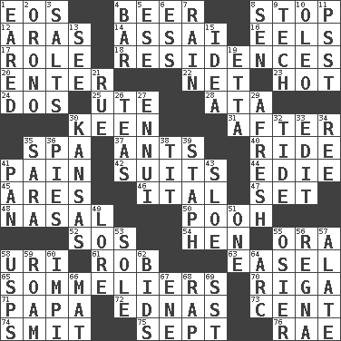 ACROSS 1. Greek goddess of the dawn 4. Fermented drink made from hops 8. Halt 12. Caspian sea tributary 14. Slender Brazilian palm 16. Snakelike fish 17. Hero or heavy, e.g. 18. Dwellings 20. Keyboard key 22. Fish or hair follower 23. Being at a high temperature 24. Two (Sp.) 25. Shoshoni 28. "One Day ___ Time" 30. Peachy ____! 31. Following 35. Health resort 37. Pismires 40. Travel on an animal 41. Ache 42. Sets of matching outer garments 44. Singer Brickell 45. Ancient Greek god of war 46. Slanted text style (abbr.) 47. Arrange properly for use 48. Relating to the nose 50. "Silly old bear" 52. Mayday 54. Layer 55. Mouth or opening 58. RI univ. 61. Director Reiner 63. Artist's stand 65. Wine waiters 70. Capital of Latvia 71. Dad 72. Ferber et al. 73. Penny 74. Stricken, poetically 75. Back-to-school mo. 76. Actress Charlotte DOWN 1. Having ears or earlike features 2. U. of Maine site 3. Table seasonings 4. Drinking establishment 5. Compass dir. 6. Double-curved letter 7. Water falling in drops from the sky 8. Elected rep. 9. Technical work 10. Butter sub 11. Inconspicuous attention getter 13. Perceive with the eye 15. The main thing one is thinking about 19. Singer James 21. Regret 26. Beverages made from leaves 27. World-weariness 29. Anew 30. Sunflower state 32. Event that recurs at intervals 33. Prepare for publication 34. To separate or throw off 35. "Two Mules for Sister ____" 36. Sliced desserts 38. Teat (slang) 39. Staphylococcus 41. Baking dish 43. _ gin 49. Old wives' tales, e.g. 51. Single 53. Not divided or shared with others 55. Flexible twig of a willow tree 56. Canadian anthropologist Darnell 57. Having winglike extensions 58. United States Postal Service (abbr.) 59. Wander aimlessly 60. Body of Kaffir warriors 62. Auction offers 64. Curve 66. Floor protector 67. Compass dir. 68. Strike 69. Fast jet (abbr.)
