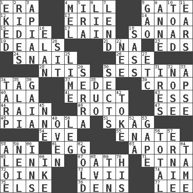 ACROSS 1. Epoch 4. Place where flour is made 8. Yard entry 12. Sleep 13. One of the Great Lakes 14. Small Philippine buffalo 15. Singer Brickell 17. (Had) reclined 18. Echolocation 19. Allots cards 21. Heredity factor (abbr.) 23. Begley and Asner 24. Slow-paced one 26. Compass dir. 28. Nuclear Threat Initiatives 30. French poetic form 34. Label 37. Ancient Persian 39. Riding implement 40. Insect wing 41. Spew [out] 43. Double-curved letter 44. Water falling in drops from the sky 46. Printing process, for short 47. Perceive with the eye 48. Player piano 51. Heroin 54. First lady 55. Related on the mother's side 58. Cuckoo 61. Ovum 63. To the left, to Queeg 65. Soviet premier 1918-24 67. Pledge 71. Inactive volcano in Sicily 72. Pig sound 73. 57 in ancient Rome 74. Direct toward a target or goal 75. Otherwise 76. Hiding places for outlaws 77. Area sheltered from the wind DOWN 1. Made supply last 2. Amusement-park features 3. Bee-related 4. Cartoonist voice _ Blanc 5. Lyricist Gershwin 6. Cards in a Roman deck? 7. Grant temporary use of 8. E Mali city 9. Queen of England 1702-14 10. Frog relative 11. Hearing organs 16. Liveliness 18. Backtalk 20. Be seated 22. Born 25. Welles in "The Third Man" 27. And so on (abbr.) 29. Father Junipero _ 30. Religious groups 31. Angers 32. Characteristic smell of wine 33. Domed church section 34. Canvas cover 35. Jai ____ 36. Greek goddess of the earth (variant) 38. Superhero pair 42. Puff or smoke 45. Compass dir. 49. Baking chamber 50. Part of a journey 52. Santa ___, CA 53. Yawn 56. "_____ Recall" 57. Bert's buddy 58. _ vera 59. Famous astronaut Armstrong 60. Lodging establishments 62. Precious metal 64. Not wild 66. D.D.E's nickname 68. "___ Maria" 69. Metal container 70. Part of HMS, perhaps