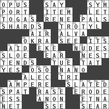 ACROSS 1. Musical composition 5. Declare 8. Symbol (abbr.) 11. Left side of a ship or aircraft 12. A whole individual unit 14. Allow 15. Ancient Roman robes 17. French philosopher Descartes 18. Friends 19. Broken pieces 21. Trinitrotoluene 23. Wind 25. Inventor's middle name 26. Gumbo ingredient 27. Perceive with the eye 28. It is 31. Help 33. Make supply last 35. Unclothed pictures 37. A type of plum 38. Ewer handle 40. A home for chicks 41. Watches over 43. Third day of the wk. 45. Make lace 46. It is so 47. Bear (Spanish) 50. Billionth: prefix 52. Actor Baldwin 53. Three (prefix) 54. Electrical Unit 56. Scheduled 61. Argument over a trivial matter 62. Raze (variant) 65. Wear away 66. Double-curved letter 67. At once, immediately (arch.) 68. Inactive volcano in Sicily 69. Fish or hair follower 70. Compass dir. 71. Singe DOWN 1. Elects 2. "Silly old bear" 3. Capital and largest city of Mongolia 4. Play the lead 5. Title for a knight 6. Had dinner 7. Gossips 8. Kill 9. Shout 10. Mountains (abbr.) 13. Haggard of country music 16. Neighbor of Neb. 18. Parent Teacher Assoc. 20. Father 22. Baking chamber 24. Immoral or dissolute person 26. Wrote a lyric poem 28. The main thing one is thinking about 29. Trial 30. Fast jet (abbr.) 31. Toward shelter 32. Charged particles 34. Consume 36. To (old English) 37. Filthy place 39. The smallest animal of a litter 42. Not divided or shared with others 44. Hearing organs 48. Spanish missionary in California 49. Seas 51. "Death on the ____" 52. Fitting 54. Domed church section 55. Vertical spar for supporting sails 57. Ancient Greek god of war 58. Lug 59. Pulitzer Prize-winning author Ferber 60. Letter starter 61. Elected rep. 63. Distress signal 64. Compass dir.
