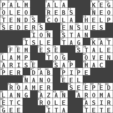 ACROSS 1. Inside of hand 5. Insect wing 8. Cask 11. Margarine 12. Confederate soldiers (slang) 14. Modern: prefix 15. Watches over 17. Root beer relative 18. Assist 19. Spring feasts 21. Takes place subsequently 23. Electrically charged atom 25. Comedian Laurel of Laurel & Hardy 26. Capri or Wright 27. Label 28. Krazy ___ of comics 31. Opposite of masc. 33. Compass dir. 35. Showing deterioration from age 37. Desk light 38. Coat; cloak 40. Baking chamber 41. Originate 43. Plant excrement 45. Apple computer (short form) 46. For each 47. Apply (a substance) by light strokes 50. Corncob 52. Billionth: prefix 53. Snakelike fish 54. Wanderer 56. Oozed 61. Long (Scottish) 62. Muslim summons to prayer 65. Odor 66. And so on (abbr.) 67. Hero or heavy, e.g. 68. SW Saudi Arabia district 69. Unit of force equal to gravity 70. Call ___ day 71. Wig DOWN 1. Cooking vessels 2. Toward shelter 3. Grant temporary use of 4. Method 5. Curve 6. Lion 7. Most capable 8. Leg joint 9. Snakelike fish 10. Grand Old Party 13. Before Barbara or Clara 16. Indian titles of respect 18. Attila the _ 20. Flatfish 22. Sinks 24. A home for chicks 26. Naughty children 28. Polynesian shrub of the pepper family 29. Actor Baldwin 30. "___ Little Indians" 31. Conductor's collection 32. Independent ruler or chieftain 34. Greek goddess of the dawn 36. Heavy book 37. Infant locale 39. Open wide 42. Dutch treat 44. Sliced desserts 48. Approach 49. Tall fast-moving dog breed 51. Entreaty 52. Tired old horse 54. Assign a rank or rating to 55. At one time in the past 57. Part of Q.E.F. 58. Introduce or present, as a question 59. Give off 60. Have the gumption 61. Part of a journey 63. Keyboard modifier key 64. Teachers' org.