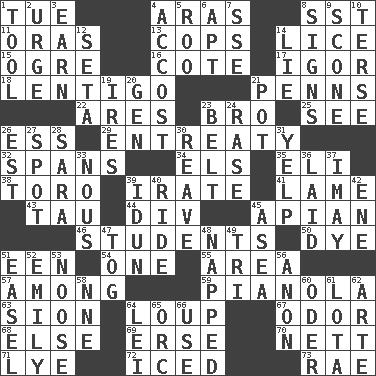 ACROSS 1. Third day of the wk. 4. Caspian sea tributary 8. Fast jet (abbr.) 11. Mouths or openings 13. 911 reaches them 14. Louse (plural) 15. Legendary monster 16. ____ d'Azur (French Riviera) 17. Russian composer Stravinsky 18. Small, flat, pigmented spot on the skin 21. Actor Sean's family 22. Ancient Greek god of war 23. Sis' sibling 25. Perceive with the eye 26. Curvy letter 29. Plea 32. Connects, as a bridge 34. Raised railways 35. Connecticut Ivy Leaguer 38. "Corrida" creature 39. Feeling or showing extreme anger 41. Unable to walk 43. The 19th letter of the Greek alphabet 44. HTML Container Element 45. Bee-related 46. SAT takers 50. Color 51. Car or cant ending 54. Single 55. Type of rug 57. Amid 59. Player piano 63. The Jewish people; Israel 64. Central Nebraska county 67. Scent 68. Otherwise 69. Celtic language 70. Remaining after all deductions 71. Sodium hydroxide 72. On the rocks 73. Actress Charlotte DOWN 1. Utensil 2. Goad 3. Merit 4. Buttonhole 5. Friend of Pooh 6. Fitting 7. Compass dir. 8. Omens 9. Biscuitlike quick bread 10. Laconic 12. Bristle 14. Falsehood 19. Angers 20. Commissioned mil. rank 21. Cooking vessel 23. Waist strap 24. To erase 26. Eastern Standard Time (abbr.) 27. Specific locale 28. "Two Mules for Sister ____" 30. Break or tear apart 31. Sharp bark 33. Common sense 36. Put down 37. "If ____ say so..." 39. Goddess of spring and wife of Bragi 40. Travel on an animal 42. Compass dir. 45. Toward the sea 47. Coat; cloak 48. Slept 49. Three (prefix) 51. Artist's stand 52. Poet Dickinson 53. Trap for birds or small mammals 56. At once, immediately (arch.) 58. Compass dir. 60. Baltic tributary 61. Globular water bottle used in Asia 62. Johnson of "Laugh-In" 64. Luau accessory 65. The grampus (Milton) 66. Purpose