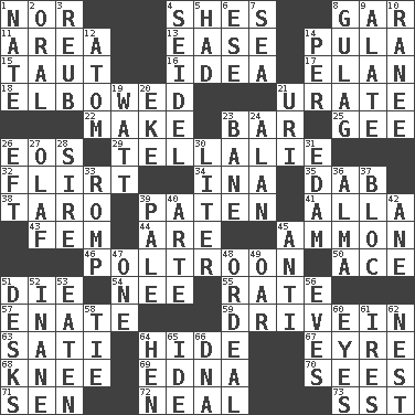 ACROSS 1. And not 4. "______ My Girl" (Turtles hit) 8. Slender fish 11. Type of rug 13. Relaxation 14. Monetary unit of Botswana 15. Tense 16. It may be bright or harebrained 17. Liveliness 18. Turned at an angle; bent 21. A salt of uric acid 22. Cause to be 23. Oblong piece of solid material 25. Unit of force equal to gravity 26. Greek goddess of the dawn 29. Copy Pinocchio 32. Talk or behave amorously 34. _ tizzy (2 wds.) 35. Apply (a substance) by light strokes 38. Pacific island yam 39. Eucharist need 41. Silent film actress Nazimova 43. Opposite of masc. 44. "We ___ not amused" (Victoria) 45. ID or VA city 46. Coward 50. Adept person 51. Expire 54. Born 55. Pace 57. Maternal 59. Popular '50s hangout 63. Suttee (variant) 64. Flintstone garb 67. Jane of fiction 68. Leg joint 69. Pulitzer Prize-winning author Ferber 70. Observes 71. Elected rep. 72. Actress Patricia 73. Fast jet (abbr.) DOWN 1. Nathan's nickname 2. Spoken 3. Reuben's nickname 4. A glass for beer 5. Possessed 6. Compass dir. 7. Ocean 8. POW camp 9. Having winglike extensions 10. Indian princess (variant) 12. Tiny particle 14. For each 19. Electrical Unit 20. Supplement with great effort 21. RI univ. 23. Object of repulsion 24. ____ Jay Lerner 26. Bank Draft (abbr.) 27. Norwegian king 28. Male parent of an animal 30. 61 cubic inches 31. Dutch treat 33. Play 36. _ mater 37. Group of countries in special alliance 39. Light colored 40. Johnson of "Laugh-In" 42. One (Scot) 45. Opposed to 47. Single 48. Severe or trying experience 49. Rowing implement 51. Writing tables 52. Silly 53. Ingested 56. Nights before holidays 58. Make a knot 60. Snake ____ (dice throw) 61. Angers 62. A home for chicks 64. Layer 65. Binary compound 66. Heredity factor (abbr.)
