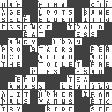 ACROSS 1. Actress Charlotte 4. Inactive volcano in Sicily 8. Lubricate 11. Personal question 12. Plunders 14. Object of repulsion 15. Automatically 17. A person who is older than you are 18. "Tell ____ the Marines!" 19. Substance 21. Potato state 23. Erode 24. Double-curved letter 25. "60 Minutes" Commentator Rooney 27. Grant temporary use of 30. Adept person 31. Flight of steps 34. For each 37. Sep. follower 38. Assad's deity 39. Adept person 40. Definite Article 41. Rest room 43. Before (prefix) 44. Sliced desserts 45. He sold his birthright 47. Australian flightless bird 49. Afternoon social gathering 50. Collect or gather 52. Small, flat, pigmented spot on the skin 56. Set down 57. Baseball hit which scores a run 60. SW Asia republic 61. Friends 62. Tall tales 63. And so on (abbr.) 64. Attempt 65. Travel on or in a vehicle 66. Perceive with the eye DOWN 1. Raze (variant) 2. Grows older 3. Snakelike fish 4. Opt 5. Lacquered or enameled metalware 6. Allow head to fall sleepily 7. Had dinner 8. Expletives 9. To the inside or interior of 10. Lion 13. Indian title of respect (Mr.) 14. Prejudice 16. Nourish 20. Negative votes 22. Lair 25. Bowlike part 26. Observe 27. Ms. Damita and namesakes 28. Of the mouth 29. American tennis player Robert 30. Cooking vessel 32. Jacques of French films 33. _ vera 34. Dad 35. Shade of tan 36. To riddle 42. Adolescent 44. Tenth month of the Hindu calendar 46. Suttee (variant) 47. Poet Dickinson 48. Floor protectors 49. Laconic 50. Having or resembling wings 51. Like a shrinking violet 52. Grant temporary use of 53. Angers 54. Yard entry 55. At one time in the past 56. Fitting 58. Boat paddle 59. Medical imaging device (abbr.)