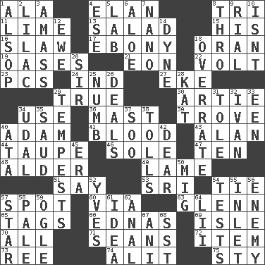 ACROSS 1. Insect wing 4. Liveliness 8. Three (prefix) 11. Welles in "The Third Man" 13. First course 15. Part of HMS, perhaps 16. Cole _ (cabbage dish) 17. Black 18. Northwest Algerian city 19. Fertile tracts in a desert 21. A really long time 22. Electrical Unit 23. Personal Computers (abbr.) 24. Indiana (abbr.) 27. Make supply last 29. Loyal 30. Nick name for Arthur 34. Purpose 36. Vertical spar for supporting sails 39. Collection of objects 40. First man 41. Vital fluid 43. Actor Alda or Thicke 44. Grayish beige 46. Not divided or shared with others 47. Nine, plus one 48. Tree or shrub in the Birch family 49. Unable to walk 51. Declare 53. _ Lanka 54. Standoff 57. Specific locale 60. By way of 63. American astronaut and politician John 65. Labels 66. Ferber et al. 69. Small island 70. Everything 71. Actors Connery and Penn 72. Detail 73. To separate or throw off 74. Came down and settled, as after flight 75. Filthy place DOWN 1. Columnist Joseph or Stewart 2. Pale purple color 3. Collect or gather 4. Compass dir. 5. Experiment locale 6. Medicinal plant 7. Billionth: prefix 8. Through, poetically 9. Monetary unit of Yemen 10. Is not 12. She-sheep 14. Centimeter-gram-second unit of force 18. Make much ado about nothing 20. Title for a knight 25. Unfeeling 26. Allots cards 28. Krazy ___ of comics 29. Storms 31. Lacquered or enameled metalware 32. "Terrible" tsar 33. Car or cant ending 34. Freehold land 35. Saudi Arabian king (1953-1964) 37. "Barney Miller" actor Jack 38. For Whom the Bell _____ 40. _ moment's notice (2 wds.) 42. Letter starter 45. Period 50. Russian fighter aircraft 52. Jacques Cousteau's middle name 54. Trials 55. An arm off of a larger body of water 56. Foe 57. Play the lead 58. Diluted with white 59. Stare 61. It may be bright or harebrained 62. Of or related to the anus 64. Cards in a Roman deck? 67. Black tropical American cuckoo 68. Fast jet (abbr.)