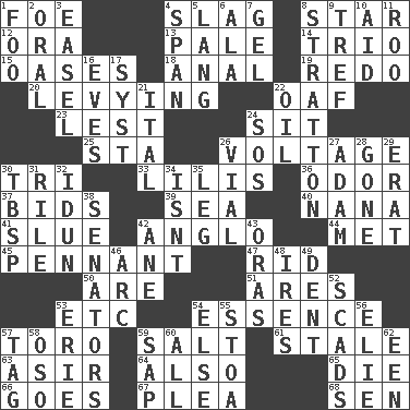 ACROSS 1. Enemy 4. Volcanic refuse 8. Play the lead 12. Mouth or opening 13. Light colored 14. Musical group of three 15. Fertile tracts in a desert 18. Of or related to the anus 19. Make new 20. Imposing or collecting, as a tax 22. Clumsy lout 23. For fear that 24. Be seated 25. R.R. building 26. Electrical Measurement 30. Three (prefix) 33. Ms. Damita and namesakes 36. Aroma 37. Auction offers 39. Ocean 40. Nanny 41. Turn sharply 42. White American of non-Hispanic descent 44. Was introduced to 45. Pre-World Series prize 47. To free from 50. "We ___ not amused" (Victoria) 51. Ancient Greek god of war 53. And so on (abbr.) 54. Substance 57. "Corrida" creature 59. Table seasoning 61. Lacking originality or spontaneity 63. SW Saudi Arabia district 64. In addition 65. Pass on 66. Travels 67. Entreaty 68. Elected rep. DOWN 1. Egg _ yung 2. Taken by mouth 3. Artist's stand 4. Connect, as a bridge 5. Long (Scottish) 6. Wing 7. Set 8. Ski resort town in Vermont 9. Not kosher 10. Help 11. Friend of Pooh 16. Nights before holidays 17. System (abbr.) 21. Slanted text style (abbr.) 22. Petroleum 24. Mayday 26. Small bottle 27. First man 28. Went 29. Part of Q.E.F. 30. Cook's measure (abbr.) 31. Cause heat under the collar 32. Goddess of spring and wife of Bragi 34. Is not 35. Part of a journey 38. Legislators 42. A saturated hydrocarbon 43. Mouths or openings 46. Curve 48. Angers 49. Scratch 52. Large numbers or amounts 53. 4th largest of the Great Lakes 54. Otherwise 55. Portico 56. Writer Wiesel 57. Label 58. Bear (Spanish) 59. Plant excrement 60. Everything 62. Car or cant ending