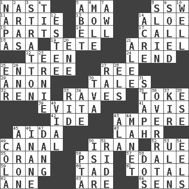 ACROSS 1. Political cartoonist Thomas 5. Nursemaid (var.) 8. Compass dir. 11. Nick name for Arthur 13. Arrow shooter 14. Medicinal plant 15. Actors' quests 16. Pipe bend 17. Give a ring to 18. White ___ sheet 19. Wig 21. Satellite of Uranus 22. Adolescent 24. Grant temporary use of 25. Main course 27. To separate or throw off 29. At once, immediately (arch.) 30. Lies 32. Painter Guido (1575-1642) 33. All-night dance parties 35. Puff or smoke 39. Webber/Rice musical 41. Advice 42. Binary compound 43. Electrical Unit 45. Opera by Verdi 48. Cowardly lion portrayer 49. Lessep's creation 50. SW Asia republic 52. Regret 55. Northwest Algerian city 56. 23rd letter of the Greek alphabet 57. Peak District village in England 59. Yearn 60. Small amount or degree 61. Add up to 62. A saturated hydrocarbon 63. "We ___ not amused" (Victoria) 64. Elected reps. DOWN 1. California wine valley 2. Ancient river in northeast Turkey 3. Ski resort town in Vermont 4. Teat (slang) 5. Collude with 6. Undercover agent 7. Leather borer 8. Killed 9. Having a sole or soles 10. Water source 12. First name in cosmetics 14. Land measure 20. Compass dir. 21. Toward shelter 23. Bert's buddy 25. Hearing organ 26. Compass dir. 27. Actress Charlotte 28. Raised railways 30. Federal power corp. 31. Staphylococcus 33. To free from 34. Had dinner 36. Make much ado about nothing 37. Apertif with cassis 38. Compass dir. 40. Small bottle 43. According to 44. French painter Edouard 45. Composer Copland 46. Lacking in sense or substance 47. Mild oath, euphamism for damn 49. Root beer relative 50. Austrian river, tributary to the Danube 51. Travel on or in a vehicle 53. ____ Bator 54. Snakelike fish 56. Parent Teacher Association (abbr.) 58. Two (Sp.)
