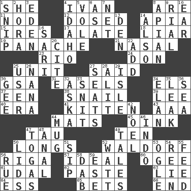 ACROSS 1. A female animal or person 4. _ the terrible 8. "We ___ not amused" (Victoria) 11. Dreamland 12. Administered medicine 14. Capital of Western Samoa 15. Angers 17. Having winglike extensions 18. One who doesn't tell the truth 19. Flamboyance 21. Rhinal 23. River (Sp.) 24. Spanish title 25. A single undivided whole 27. Alleged 30. Girls' org. (abbr.) 31. Artist's stands 34. Raised railways 37. Car or cant ending 38. Slow-paced one 39. Area sheltered from the wind 40. Epoch 41. Baby cat 43. Auto club (abbr.) 44. Floor coverings 45. Pig sound 47. The 19th letter of the Greek alphabet 49. "___ Little Indians" 50. Yearns 52. Apple salad 56. Capital of Latvia 57. Standard of perfection 60. Double curve, resembling the letter S 61. Hereditary estate 62. Thick mixture 63. Whopper 64. Curvy letter 65. Stakes 66. Conclusion DOWN 1. Sever or remove by pinching or nipping 2. Israeli folk dance 3. Paradise 4. Potato state 5. Short-tailed, large-bodied rat 6. White ___ sheet 7. Fish or hair follower 8. Bee-related 9. Monetary unit of Yemen 10. Ewer handle 13. Lair 14. In addition 16. Indian skirt 20. Quote 22. Increase 25. One who makes use of a thing 26. Grandmother 27. Theater features 28. Set down 29. Small island 30. Unit of force equal to gravity 32. "____ silly question..." 33. In a ____ (agitated or irritated) 34. Flair 35. Path through which fluid escapes 36. Ocean 42. Christmas carol 44. Large cup 46. Southeast Asian peninsula 47. Ancient Roman robes 48. Of or related to the anus 49. Stories 50. Hats (slang) 51. Small drink 52. Electrical Unit 53. Stare at amorously 54. It's straight from the horse's mouth 55. Nourish 56. Sorrow 58. Pat or tap gently 59. Compass dir.