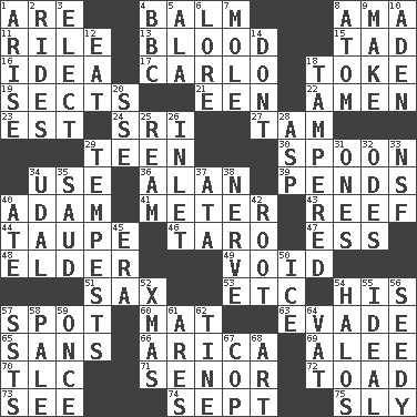 ACROSS 1. "We ___ not amused" (Victoria) 4. Lip ointment 8. Housemaid (var.) 11. Cause heat under the collar 13. Vital fluid 15. Small amount or degree 16. The content of cognition 17. Monte _, Las Vegas Hotel/Casino 18. Casino tip 19. Religious groups 21. Car or cant ending 22. So be it 23. Eastern Standard Time (abbr.) 24. Indian title of respect (Mr.) 27. Scottish cap 29. Adolescent 30. Soup utensil 34. Purpose 36. ____ Jay Lerner 39. Depends 40. First of billions? 41. Distance measurement 43. Coral collection 44. Grayish beige 46. Pacific island yam 47. Curvy letter 48. A person who is older than you are 49. Lacking any legal or binding force 51. Saxophone 53. And so on (abbr.) 54. Part of HMS, perhaps 57. Specific locale 60. Floor covering 63. Elude 65. Without 66. N. Chile seaport 69. Toward shelter 70. Affectionate concern, for short 71. Sir (Sp.) 72. Frog relative 73. Observe 74. Back-to-school mo. 75. Mischievous DOWN 1. Originate 2. Amusement-park features 3. Opt 4. English channel? 5. Wing 6. Old wives' tales, e.g. 7. Undercover agent 8. Tiny particle 9. Cause to be 10. Arabian gulf 12. Consume 14. Do not 18. ________ with (broke a safety seal) 20. Compass dir. 25. 480, 500 or 516 sheets of paper 26. An arm off of a larger body of water 28. Viper 29. Storms 31. Washington bills 32. Lyric poems 33. Science/research agcy. 34. Hereditary estate 35. Saudi Arabian king (1953-1964) 37. _ moment's notice (2 wds.) 38. Effrontery 40. Had dinner 42. Carrot, for example 45. Epoch 50. Frozen water 52. Dec. holiday 54. Auras 55. Standard of perfection 56. Full of seeds 57. Fast planes 58. Diluted with white 59. Single time 61. Ancient Greek god of war 62. Prong on a fork 64. Large container 67. Police officer (slang) 68. Nonscientific branch of learning