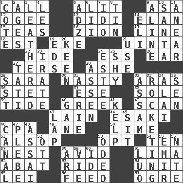 ACROSS 1. Give a ring to 5. Came down and settled, as after flight 9. White ___ sheet 12. Double curve, resembling the letter S 13. "You Light Up My Life" star Conn 14. Flair 15. Afternoon social gatherings 16. The Jewish people; Israel 17. Actor's bit 18. Eastern Standard Time (abbr.) 19. Make supply last 21. National forest in Provo, Utah 22. Flintstone garb 24. Double-curved letter 26. Ewer handle 27. Laconic 28. American tennis player Robert 29. "Two Mules for Sister ____" 30. Smutty 32. Ancient river in northeast Turkey 36. Proofreading order 37. Compass dir. 38. Not divided or shared with others 39. Periodic rise and fall of the sea level 40. Of Greece 42. Examine hastily 43. (Had) reclined 44. 1973 Nobel Price Winner (Physics) Leo 46. Accounting whiz (abbr.) 49. One (Scot) 50. Welles in "The Third Man" 51. Columnist Joseph or Stewart 53. Choose 54. Nine, plus one 57. A home for chicks 58. Enthusiastic 61. Pale green bean 62. Blind as ____ 63. Travel on an animal 64. A single undivided whole 65. Luau accessory 66. Nourish 67. Legendary monster DOWN 1. ____ d'Azur (French Riviera) 2. Ripens 3. Resembling or made to resemble leather 4. French article 5. Edge tool used to cut and shape wood 6. Cards in a Roman deck? 7. Wedding promise 8. Metal container 9. Place in a line 10. Before Barbara or Clara 11. Approach 14. Connecticut Ivy Leaguer 19. Begley and Asner 20. Peachy ____! 21. Purpose 23. Feeling or showing extreme anger 24. First name in cosmetics 25. Like a shrinking violet 27. Jacques of French films 28. NE Netherlands city 29. Fast jet (abbr.) 31. Nest on high 32. Indian state 33. Shooting up abruptly 34. Jai _ 35. Elected rep. 40. Separate the seeds from cotton 41. Seaweed 43. Pet locale 45. Be seated 46. Lessep's creation 47. Military trainee 48. Slender Brazilian palm 52. Baseball player Mel 53. Wrote a lyric poem 55. Independent ruler or chieftain 56. Nathan's nickname 58. Sandy's bark 59. Compete 60. Binary compound 61. Nilotic language