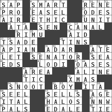 ACROSS 1. Plant excrement 4. Don Adams' spy role 9. French philosopher Descartes 13. Adept person 14. Artist's stand 15. Lyric poems 16. Wind 17. Moral principle 18. A single undivided whole 19. "One Day ___ Time" 21. Elected rep. 22. Lessep's creation 24. Tall New Zealand timber tree 26. Assist 27. Sadhe (variant) 29. Airtight sealed metal containers 30. Bee-related 31. The sixth month of the Jewish calendar 33. Had dinner 36. Allow 37. Legislator 40. Ocean 41. Begley and Asner 42. Farming town in central California 43. Fertile tracts in a desert 45. Type of rug 47. Place in a line 48. Nervous spasm 49. Dec. holiday 50. Snob 52. Male child 54. Call ___ day 56. Stitch closed the eyes of (a falcon) 57. Makes a sale 59. Personal question 61. Slanted text style (abbr.) 62. Saint headwear 63. Compass dir. 64. Friends 65. Peak District village in England 66. Make a knot DOWN 1. Health resort 2. Operatic vocal solo 3. Likenesses of persons 4. Perceive with the eye 5. Taiwanese island in East China Sea 6. American tennis player Robert 7. It's straight from the horse's mouth 8. Affectionate concern, for short 9. Periods in a boxing match 10. Pulitzer Prize-winning author Ferber 11. Famous astronaut Armstrong 12. Eastern Standard Time (abbr.) 20. Opera by Verdi 22. Capital of Egypt 23. The 18th letter of the Arabic alphabet 25. Not women's 27. Story 28. Broke a traffic law 29. Jacques of French films 31. Small Philippine buffalo 32. June honoree 33. Aide 34. Adolescent 35. Relaxation 38. Opt 39. Wander 44. Jai ____ 45. Ringlike coral islands and reefs 46. _ de Janeiro 49. Xylene (variant) 50. Stalk of a moss capsule 51. Anneal 52. Necklace unit 53. Spanish pot 55. Hindu god of fire 56. Small drink 57. A female animal or person 58. Compass dir. 60. She-sheep
