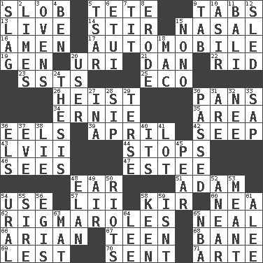 ACROSS 1. Messy guy 5. Wig 9. Bar bills 13. Not recorded 14. Use a swizzle stick 15. Rhinal 16. So be it 17. Form of transportation 19. Commissioned military rank (abbr.) 20. RI univ. 21. One of the 12 tribes of Israel 22. To free from 23. Fast planes 25. Environmental prefix 26. Robbery 30. Zero-star reviews 34. Bert's buddy 35. Type of rug 36. Snakelike fish 39. Showery time 42. Ooze 43. 57 in ancient Rome 44. Obstructs or blocks passage 46. Observes 47. First name in cosmetics 48. Hearing organ 51. First of billions? 54. Purpose 57. Cards in a Roman deck? 58. Apertif with cassis 60. Teachers' org. 62. Frustrating wastes of time 65. Be tempered by heat 66. Believer in; advocate of (suffix) 67. Adolescent 68. Object of repulsion 69. For fear that 70. Emitted 71. Johnson of "Laugh-In" DOWN 1. Volcanic refuse 2. Citrus fruits 3. Baking chambers 4. Benjamin's nick name 5. Russian ruler of old 6. Needle holder 7. Teat (slang) 8. Wear away 9. Keyboard key 10. SW Saudi Arabia district 11. Indonesian resort city 12. Downhill vehicle 15. Words to Nanette 18. Big _ 20. One who makes use of a thing 24. College paper 27. _ tizzy (2 wds.) 28. Small drink 29. Laconic 30. Went by 31. "We ___ not amused" (Victoria) 32. Born 33. Plant excrement 36. Raised railways 37. Night before a holiday 38. Untruth 40. ___ a Wonderful Life 41. Car dealer's back yard 45. Lightbulb-shaped fruit 48. Liveliness 49. Atmosphere 50. Debaucheries 52. Approach 53. Intended 54. Mountain range 55. Beget 56. Armor plate that protects the chest 58. Peachy ____! 59. Is not 61. Toward shelter 63. Floor covering 64. Area sheltered from the wind 65. Basketball assoc.
