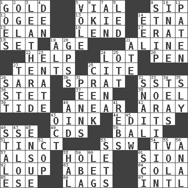 ACROSS 1. Gilded 5. Small bottle 9. Small drink 12. Double curve, resembling the letter S 13. Migrant worker of the '30s 14. Inactive volcano in Sicily 15. Style 16. Grant temporary use of 17. Part of Q.E.F. 18. Arrange properly for use 19. Mature 21. Place in a line 22. Aid 24. Car dealer's back yard 26. Fenced enclosure 27. Portable shelters 28. Quote 29. "Two Mules for Sister ____" 30. Small fatty European fish 32. Fast planes 36. Proofreading order 37. Car or cant ending 38. Christmas carol 39. Periodic rise and fall of the sea level 40. Approach 42. Like ___ of sunshine 43. Pig sound 44. Prepares for publication 46. Compass dir. 49. Music discs 50. Indonesian resort city 51. Colored lightly or faintly 53. Compass dir. 54. Federal power corp. 57. In addition 58. Hollow 61. The Jewish people; Israel 62. Central Nebraska county 63. Collude with 64. Root beer relative 65. Compass dir. 66. Straggles 67. International (abbr.) DOWN 1. Leaves 2. Stare 3. Resembling or made to resemble leather 4. Lair 5. Short-tailed, large-bodied rat 6. Mamie's mate 7. The 18th letter of the Arabic alphabet 8. Directed 9. Long narrow piece of something 10. Lacking in sense or substance 11. Eucharist need 14. Snakelike fish 19. Keyboard modifier key 20. Global Positioning Systems (abbr.) 21. Had dinner 23. Maternal 24. Woody, climbing, usually tropical plant 25. Baseball player Mel 27. Jacques of French films 28. Small stream 29. Fast jet (abbr.) 31. Actor Sean's family 32. Slow-paced one 33. Determination 34. Beverages made from leaves 35. Secret 40. Help 41. Confederate soldiers (slang) 43. Sep. follower 45. Simpleton 46. Having lost freshness 47. Grain storage towers 48. Take place subsequently 52. Police officer (slang) 53. Puts into a specified state 55. Electrical Unit 56. Of or related to the anus 58. Actor Linden 59. Chief or king in Benin or Nigeria 60. Part of a journey 61. _-fi