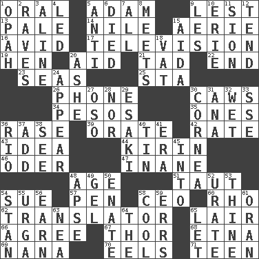 ACROSS 1. Spoken 5. First man 9. For fear that 13. Diluted with white 14. The longest river in the world 15. Nest on high 16. Enthusiastic 17. Household entertainment appliance 19. Layer 20. Help 21. Small boy 22. Conclusion 23. Oceans 25. R.R. building 26. Give a jingle 30. Crow sounds 34. Mexican monetary units 35. Washington bills 36. To erase 39. Speak pompously 42. Pace 43. The main thing one is thinking about 44. Japanese brewing company 46. Baltic tributary 47. Empty; void 48. Personal question 51. Strained 54. Institute legal proceedings 57. Animal enclosure 58. Corporate head (abbr.) 60. 17th letter of the Greek alphabet 62. Interpreter 65. Den 66. Match 67. Son of Odin 68. Inactive volcano in Sicily 69. Grandmother 70. Snakelike fish 71. Adolescent DOWN 1. Brightly colored fish 2. All-night dance parties 3. Place in a line 4. Directed 5. Opposed to 6. Passed on 7. 100% 8. Confronts 9. French article 10. 4th largest of the Great Lakes 11. The Jewish people; Israel 12. Watch over 15. Opera by Verdi 18. Large container 20. American tennis player Robert 24. Become visible 27. Bear (Spanish) 28. And not 29. 1973 Nobel Price Winner (Physics) Leo 30. Pupil covering 31. Santa ___, CA 32. Dripping 33. Compass dir. 36. River (Sp.) 37. Say or write further 38. Observe 40. Shallow baking pan 41. Period 45. To the inside or interior of 48. Domed church section 49. Set 50. Maternal 52. A salt of uric acid 53. One or ones belonging to thee 54. Comedian Laurel of Laurel & Hardy 55. Capital and largest city of Mongolia 56. Merit 58. Calm and collected 59. Blunders 61. Northwest Algerian city 63. Teachers' org. 64. Definite Article 65. Allow
