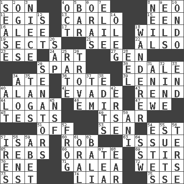 ACROSS 1. Male offspring 4. Mitch Miller's instrument 8. Modern: prefix 11. The front part of a cuirass 13. Monte _, Las Vegas Hotel/Casino 15. Car or cant ending 16. Toward shelter 17. Lag or linger behind 18. Rampant 19. Religious groups 21. Perceive with the eye 22. In addition 23. Compass dir. 24. Tate display 27. Commissioned military rank (abbr.) 29. Coast Guard woman 30. Peak District village in England 34. Had dinner 36. Lug 39. Soviet premier 1918-24 40. ____ Jay Lerner 41. Elude 43. Tear apart 44. Utah city north of Ogden 46. Arab leader 47. She-sheep 48. Trials 49. Russian ruler of old 51. No longer planned or scheduled 53. Elected rep. 54. Eastern Standard Time (abbr.) 57. Austrian river, tributary to the Danube 60. Director Reiner 63. Come out of 65. Confederate soldiers (slang) 66. Declaim 69. Disorderly outburst 70. Compass dir. 71. An organ shaped like a helmet 72. Soaks 73. Fast jet (abbr.) 74. One who doesn't tell the truth 75. Compass dir. DOWN 1. Gospel singer Marvin 2. Stares 3. Sibling's daughter 4. Sep. follower 5. Soap unit 6. Mouths or openings 7. Writer Wiesel 8. Famous astronaut Armstrong 9. Snakelike fish 10. Southwest Nigerian state 12. Put into a specified state 14. Cassini of fashion 18. Roamer 20. Plant excrement 25. Assign a rank or rating to 26. Collection of objects 28. Snakelike fish 29. Legislators 31. Afresh 32. Actor's bit 33. Conclude 34. Medicinal plant 35. Labels 37. Scottish cap 38. Prepares for publication 40. The first octave above the treble staff 42. Celtic language 45. Science/research agcy. 50. Black tropical American cuckoo 52. Toadlike animal 54. _____ Park, CO 55. Sets or collections 56. Laconic 57. Angers 58. Elected reps. 59. Collude with 61. Of the mouth 62. Indonesian resort city 64. Compass dir. 67. Afternoon social gathering 68. Ewer handle