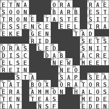 ACROSS 1. Inactive volcano in Sicily 5. Mouth or opening 8. Actress Charlotte 11. Within a short period 12. Sharp remark 14. Eastern Standard Time (abbr.) 15. Heavy duty weighing machine 17. Clothes sense 18. Be seated 19. Gist 21. Snakelike fish 22. Retirement account (abbr.) 23. Supplement with great effort 24. Commissioned military rank (abbr.) 25. Small amount or degree 27. To free from 28. Puts into a specified state 31. Mouths or openings 35. Directed 37. In a ____ (agitated or irritated) 38. Compact _ 39. Pat or tap gently 41. Land measure 42. Otherwise 43. ___ Haven, CT 45. Confront 46. It's straight from the horse's mouth 47. Modern: prefix 49. R.R. building 51. Plant excrement 52. Ocean 55. Make lace 57. Gift holder 60. Speakers 62. Epoch 63. ID or VA city 65. Saint headwear 66. "___ Little Indians" 67. Afternoon social gatherings 68. Ancient Persian 69. Ingest 70. Overdraft (abbr.) 71. Genesis locale DOWN 1. First name in cosmetics 2. Cod relative 3. Trap for birds or small mammals 4. Queen of England 1702-14 5. Chief or king in Benin or Nigeria 6. To erase 7. Johnson of "Laugh-In" 8. Dwelling 9. SW Saudi Arabia district 10. Singer James 13. Waist strap 16. Engineer (abbr.) 17. Looked after 20. To provide with a ceiling 26. Indian state 29. Hoop that covers a wheel 30. Proofreading order 31. River in Europe 32. Cause heat under the collar 33. Aide 34. Odor 36. One of the 12 tribes of Israel 40. Gillaume's butler role 44. Put on (as clothing) 48. Brightly colored fish 50. Blind as ____ 52. Having a sole or soles 53. Eat (away) 54. NE Netherlands city 55. False hair 56. Length times width 58. Sign of something about to happen 59. Dec. holiday 61. Docile 64. Order of Saint Francis (abbr.)