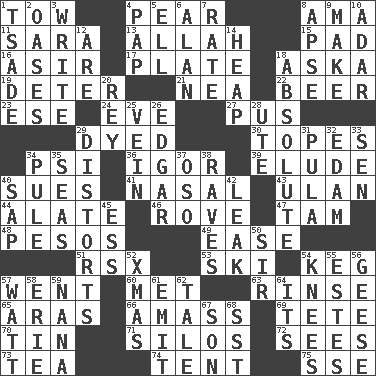 ACROSS 1. Pull behind 4. Lightbulb-shaped fruit 8. Nursemaid (var.) 11. "Two Mules for Sister ____" 13. Assad's deity 15. Groovy apt. 16. SW Saudi Arabia district 17. Food holder 18. "____ silly question..." 19. Prevent from occurring 21. Teachers' org. 22. Fermented drink made from hops 23. Compass dir. 24. First lady 27. Fluid product of inflammation 29. Colored 30. Drinks excessively 34. Air pressure measure (abbr.) 36. Composer Stravinsky 39. Evade 40. Institutes legal proceedings 41. Relating to the nose 43. ____ Bator 44. Having winglike extensions 46. Be footloose 47. Scottish cap 48. Mexican monetary units 49. Relaxation 51. Acura sports coupe 53. What Jean-Claude Killy likes to do 54. Barrel 57. Gone 60. Was introduced to 63. Wash lightly 65. Caspian sea tributary 66. Collect or gather 69. Wig 70. Metal container 71. Grain storage towers 72. Perceives with the eye 73. Beverage made from leaves 74. Portable shelter 75. Compass dir. DOWN 1. Sadhe (variant) 2. Fertile tracts in a desert 3. Compose 4. Infant food 5. Pipe bend 6. Actor Alda or Thicke 7. Pace 8. Domed church section 9. Create 10. The sixth month of the Jewish calendar 12. "We ___ not amused" (Victoria) 14. Pile 18. Utter; complete 20. Marina Del _, California 25. Distinctive style or manner 26. _ Allan Poe 28. Shoshoni 29. What propaganda does 31. Monetary unit of Botswana 32. Dutch treat 33. Elected rep. 34. Whine 35. Oceans 37. Bear (Spanish) 38. All-night dance parties 40. Plant excrement 42. Path through which fluid escapes 45. Curvy letter 50. Title for a knight 52. Dec. holiday 54. Leg joints 55. _____ Park, CO 56. Honkers 57. Electrical Unit 58. One of the Great Lakes 59. Grandmother 61. Send forth 62. Story 64. It is 67. Male child 68. Fast jet (abbr.)