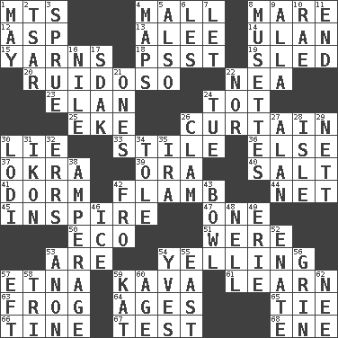 ACROSS 1. Mountains (abbr.) 4. Promenade 8. Female horse 12. Cleo's killer 13. Toward shelter 14. Uhlan (variant) 15. Entertaining tales 18. Inconspicuous attention getter 19. Downhill vehicle 20. Boisterous (Brazilian Portuguese) 22. Teachers' org. 23. Flair 24. Small child 25. Supplement with great effort 26. Window treatment 30. Untruth 33. Vertical member of a panel or frame 36. Otherwise 37. Gumbo ingredient 39. Mouth or opening 40. Table seasoning 41. Dormintory (informal) 42. Flambe (short form) 44. Fish or hair follower 45. Heighten or intensify 47. Single 50. Environmental prefix 51. We are 53. "We ___ not amused" (Victoria) 54. Crying or shouting loudly 57. Inactive volcano in Sicily 59. Polynesian shrub of the pepper family 61. Acquire or gain knowledge or skills 63. Tree-dwelling hopper 64. Matures 65. Neckwear 66. Prong on a fork 67. Trial 68. Compass dir. DOWN 1. Can I? 2. Russian ruler of old 3. Upset 4. Atlas contents 5. In addition 6. French article 7. Allow 8. French bagpipes 9. Silent film actress Nazimova 10. Actress Charlotte 11. Conclude 16. Mediterranean tributary 17. Neighbor of Neb. 21. Washington bills 22. Or not 24. Third day of the wk. 26. Burrowing marine mollusk 27. Actor Alda or Thicke 28. Capri or Wright 29. Remaining after all deductions 30. Farming town in central California 31. Visual representation of an object 32. Blunders 34. Lacquered or enameled metalware 35. Retirement account (abbr.) 38. Electrical Measurement 42. Away 43. Soup holder 46. Frozen water 48. 1994 drama film starring Jodie Foster 49. 4th largest of the Great Lakes 52. Related on the mother's side 53. At once, immediately (arch.) 54. Jacques Cousteau's middle name 55. 90 degrees 56. Smile widely 57. Newt 58. Three (prefix) 59. Krazy ___ of comics 60. Grow older 62. Born