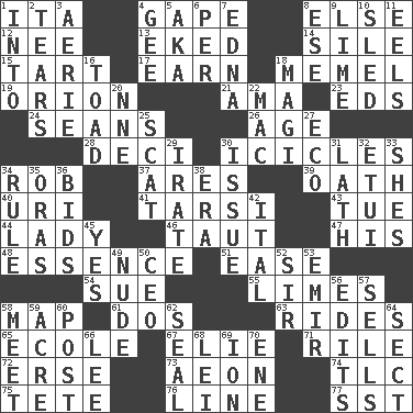 ACROSS 1. Call ___ day 4. Stare wonderingly 8. Otherwise 12. Born 13. Supplemented with great effort 14. Filth; sediment 15. Small pie 17. Merit 18. Klaipeda city 19. Greek mythologigal hunter 21. Housemaid (var.) 23. Begley and Asner 24. Seines 26. Ripen 28. Tenth: prefix 30. Winter's stalactites 34. Director Reiner 37. Ancient Greek god of war 39. Pledge 40. RI univ. 41. Tarsus (plural) 43. Third day of the wk. 44. Kenny Rogers chart-topper in '80 46. Strained 47. Part of HMS, perhaps 48. Center 51. Relaxation 54. Institute legal proceedings 55. Citrus fruits 58. Atlas unit 61. Two (Sp.) 63. Amusement-park features 65. Learning spot: Fr. 67. Writer Wiesel 71. Cause heat under the collar 72. Celtic language 73. Age 74. Affectionate concern, for short 75. Wig 76. Actor's bit 77. Fast jet (abbr.) DOWN 1. To the inside or interior of 2. Pulls into pieces 3. Nest on high 4. Unit of force equal to gravity 5. Alias (abbr.) 6. For each 7. Pulitzer Prize-winning author Ferber 8. Compass dir. 9. Welles in "The Third Man" 10. Downhill vehicle 11. Snakelike fish 16. Frog relative 18. Wise men 20. Compass dir. 22. Apple computer (short form) 25. Scram! 27. Environmental prefix 29. Feeling or showing extreme anger 30. Come out of 31. Thin strip of wood or metal 32. Needle case 33. "______ My Girl" (Turtles hit) 34. Governing power 35. Mouths or openings 36. Auction offers 38. Period 42. Slanted text style (abbr.) 45. It is so 49. Unadorned 50. Corporate head (abbr.) 52. Title for a knight 53. Arab leader 56. Prepares for publication 57. Exchanges for money 58. Confront 59. Land measure 60. Mail 62. Lick closed 64. Religious group 66. Area sheltered from the wind 68. Flowery wreath 69. Electrically charged atom 70. Compass dir.