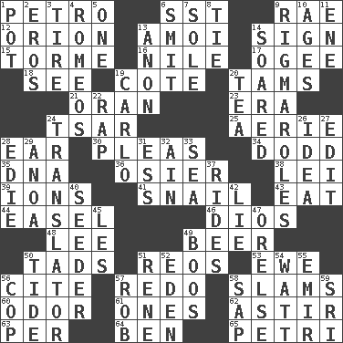 ACROSS 1. Stone: prefix 6. Fast jet (abbr.) 9. Actress Charlotte 12. Constellation of myth 13. Mine, in Marseilles 14. Attach a signature 15. Singer Mel 16. Mediterranean tributary 17. Double curve, resembling the letter S 18. Perceive with the eye 19. ____ d'Azur (French Riviera) 20. Scottish caps 21. NW Algerian seaport 23. Period 24. Russian ruler of old 25. Nest on high 28. Ewer handle 30. Entreaties 34. Texas town _ City 35. Heredity factor (abbr.) 36. Flexible twig of a willow tree 38. Luau accessory 39. Charged atoms 41. Slow-paced one 43. Erode 44. Artist's stand 46. "Vaya con ____" 48. Area sheltered from the wind 49. Fermented drink made from hops 50. Small amounts or degrees 51. Vintage cars 53. She-sheep 56. Quote 57. Make new 58. Shuts with force 60. Aroma 61. Washington bills 62. Moving or stirring 63. For each 64. Benjamin's nick name 65. _ dish (used to culture cells) DOWN 1. Cooking vessel 2. Greek god of love 3. Become fatigued 4. Lover boys 5. Single 6. Stricken, poetically 7. Flatfish 8. Neckwear 9. Complicated, petty procedures 10. Matures 11. Compass dir. 13. Soon (poet.) 14. Flew 19. Monte _, Las Vegas Hotel/Casino 20. Afternoon social gathering 22. Strike 24. Interpreter 26. The content of cognition 27. Prepare for publication 28. Singer Brickell 29. Small Philippine buffalo 31. Curvy letter 32. The 18th letter of the Arabic alphabet 33. Ocean 37. Amusement-park features 40. Sowing specialist 42. Falsehood 45. French article 47. Threatening words 49. Scornful sounds 50. Periodic rise and fall of the sea level 51. French philosopher Descartes 52. Paradise 54. Electrical Unit 55. Arab leader 56. Police officer (slang) 57. Director Reiner 58. Plant excrement 59. _ Lanka