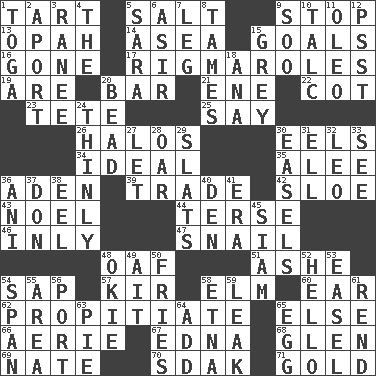 ACROSS 1. Small pie 5. Table seasoning 9. Constrict 13. Brightly colored fish 14. Toward the sea 15. Scores awarded for successful feats 16. Went 17. Frustrating wastes of time 19. "We ___ not amused" (Victoria) 20. Soap unit 21. Compass dir. 22. Small bed 23. Wig 25. Declare 26. Saint headwear 30. Snakelike fish 34. Standard of perfection 35. Toward shelter 36. An important port of Yemen 39. Buy and sell 42. _ gin 43. Christmas carol 44. Laconic 46. In an inward manner 47. Slow-paced one 48. Clumsy lout 51. American tennis player Robert 54. Plant excrement 57. Apertif with cassis 58. Shade tree 60. Ewer handle 62. Appease 65. Otherwise 66. Nest on high 67. Pulitzer Prize-winning author Ferber 68. Small, secluded valley 69. Nathan's nickname 70. Neighbor of Neb. 71. Precious metal DOWN 1. Ancient Roman robe 2. To the left, to Queeg 3. Indian princess (variant) 4. Definite Article 5. "Two Mules for Sister ____" 6. SW Saudi Arabia district 7. Part of a journey 8. Makes less strong or intense 9. "Barney Miller" actor Jack 10. Baby powder 11. Butter sub 12. Inconspicuous attention getter 15. Jennifer or Joel 18. Santa ___, CA 20. Necklace unit 24. Without viscosity 27. Allow 28. Boat paddle 29. Narrow boards 30. Artist's stands 31. Pipe bend 32. Lion 33. Observe 36. Black tropical American cuckoo 37. Spanish title 38. Snakelike fish 40. Lair 41. Period 45. Thailand, formerly 48. Migrant worker of the '30s 49. Small island 50. Strips of potato fried in deep fat 52. Phone greeting 53. Artist's stand 54. Connect, as a bridge 55. Type of rug 56. Left side of a ship or aircraft 58. Inactive volcano in Sicily 59. Path through which fluid escapes 61. Tear apart 63. Sliced dessert 64. Find the sum of 65. Oval reproductive body of a fowl