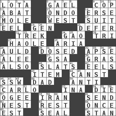 ACROSS 1. Globular water bottle used in Asia 5. Highlander 9. Police officer (slang) 12. Blind as ____ 13. Southwest Nigerian state 14. Celtic language 15. Undercover agent 16. 270 degrees 17. Set or collection 18. Snakelike fish 19. Commissioned military rank (abbr.) 21. Postpone 22. Long journey 24. E Mali city 26. Three (prefix) 27. White Person, in Hawaii 28. Roberta Peters solo 29. Old (Scot.) 30. Administered medicine 32. Domed church section 36. Toward shelter 37. Girls' org. (abbr.) 38. Pate de foie ____ 39. In addition 40. Narrow boards 42. Snakelike fish 43. A distinct part 44. 2nd pers. sing. pres. of can (arch.) 46. Compass dir. 49. Male parent 50. Against 51. Monte _, Las Vegas Hotel/Casino 53. _ tizzy (2 wds.) 54. Expire 57. Double curve, resembling the letter S 58. SW Asia republic 61. Post 62. Egg locale 63. Take ten 64. At one time in the past 65. Eastern Standard Time (abbr.) 66. Lick closed 67. Comedian Laurel of Laurel & Hardy DOWN 1. Unable to walk 2. Mitch Miller's instrument 3. Baron Munchausen's specialties 4. Had dinner 5. Bride's dress 6. A saturated hydrocarbon 7. Begley and Asner 8. Car dealer's back yard 9. An unpleasant substance 10. Flexible twig of a willow tree 11. _ dish (used to culture cells) 14. Compass dir. 19. Set 20. Made supply last 21. ___ good deed 23. Cowboy competition 24. Relatively large 25. Assist 27. Frame or body of a ship 28. Indian state 29. Auto club (abbr.) 31. Stared at amorously 32. Rep 33. Elected leader of a country 34. Table seasoning 35. Curvy letter 40. R.R. building 41. Examine hastily 43. Wedding promise 45. Santa ___, CA 46. Biscuitlike quick bread 47. Gurus 48. Obtain by seizing forcibly or violently 52. Allow 53. International (abbr.) 55. South American Indian 56. Genesis locale 58. Big collection agency 59. To sift 60. White ___ sheet 61. Mayday