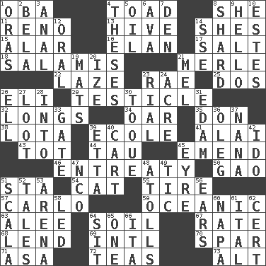 ACROSS 1. Chief or king in Benin or Nigeria 4. Frog relative 8. A female animal or person 11. Former U.S. Attorney General Janet 13. Hub of activity 14. "______ My Girl" (Turtles hit) 15. Having or resembling wings 16. Style 17. Table seasoning 18. Deli grouping 21. Haggard of country music 22. Goldbrick 23. Actress Charlotte 25. Two (Sp.) 26. Connecticut Ivy Leaguer 29. One of the two male reproductive glands 32. Yearns 34. Boat paddle 35. Spanish title 38. Globular water bottle used in Asia 39. Learning spot: Fr. 41. Mountain range southwest of Kyrgyzstan 43. Small child 44. The 19th letter of the Greek alphabet 45. Make improvements or corrections to 46. Plea 50. E Mali city 51. R.R. building 54. Domesticated feline 55. Hoop that covers a wheel 57. Monte _, Las Vegas Hotel/Casino 59. Pertaining to the sea 63. Toward shelter 64. Earth 67. Assign a rank or rating to 68. Grant temporary use of 69. International (abbr.) 70. Coast Guard woman 71. White ___ sheet 72. Afternoon social gatherings 73. The first octave above the treble staff DOWN 1. Mouths or openings 2. Actor Lugosi 3. Of or related to the anus 4. College papers 5. Lubricate 6. Actress Gardner 7. Lair 8. Broken piece 9. Phone greeting 10. _____ Park, CO 12. Relating to the mouth 14. Compass dir. 19. Floor protectors 20. Ending with capital 21. Cartoonist voice _ Blanc 23. Monetary unit of Yemen 24. Land measure 26. Pipe bend 27. Spoils 28. To the inside or interior of 30. Woman's close-fitting hat 31. Dutch treat 33. Yard entry 36. Cassini of fashion 37. Nanny 39. Singer James 40. Heavy open wagon 42. Wedding promise 45. Jane of fiction 47. Non-commissioned officer (abbr.) 48. Ringlike coral islands and reefs 49. Nervous spasm 51. Any of the three canals of the cochlea 52. Lies 53. Sports stadium 56. Hearing organs 58. Directed 60. California wine valley 61. Slanted text style (abbr.) 62. An absolute certainty 64. Be seated 65. Single 66. Call ___ day