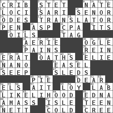 ACROSS 1. Baby bed with high sides 5. Proofreading order 9. Nathan's nickname 13. Venues 14. Indian skirt 15. Sir (Sp.) 16. Lyric poems 17. Interpreter 19. Animal enclosure 20. Viper 21. Tax preparer (abbr.) 22. ___ a Wonderful Life 23. Lubricates 25. Label 26. Nest on high 30. Stare at amorously 34. Aches 35. It's straight from the horse's mouth 36. Part of Q.E.F. 39. Curses 42. Writer Wiesel 43. Billionth: prefix 44. Artist's stand 46. Ooze 47. Bobsleighs 48. Sliced dessert 51. Letter starter 54. Raised railways 57. Small island 58. Myrna of the movies 60. Experiment locale 62. Odds 65. Pulitzer Prize-winning author Ferber 66. Collect or gather 67. Small island 68. Adolescent 69. Remaining after all deductions 70. Having a low temperature 71. Algonquian DOWN 1. Hoof sound 2. Cowboy competition 3. Ancient Celtic tribe of eastern Britain 4. Altar cloth linen 5. Fast planes 6. Canvas cover 7. Epoch 8. Tinged 9. Teachers' org. 10. Opposed to 11. A blast of a horn 12. Blunders 15. Volcanic refuse 18. Health resort 20. At sea 24. Portable computer 27. _ de Janeiro 28. _ tizzy (2 wds.) 29. _____ Park, CO 30. Threatening words 31. Set 32. Cards in a Roman deck? 33. Compass dir. 36. Followers of ems 37. Actress Charlotte 38. A saturated hydrocarbon 40. Actor Linden 41. Compass dir. 45. Whirlpool 48. Friends 49. One more than two 50. Moral principle 52. Tree or shrub in the Birch family 53. The wife of a rajah (variant) 54. Liveliness 55. Welles in "The Third Man" 56. Three-handed card game 58. Hang loosely or laxly 59. Wrote a lyric poem 61. Object of repulsion 63. Eastern Standard Time (abbr.) 64. Bear (Spanish) 65. And so on (abbr.)