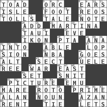 ACROSS 1. Frog relative 5. The grampus (Milton) 8. Hearing organs 12. Small island 13. 12 inches 15. Vintage cars 16. For Whom the Bell _____ 18. Falsehood 19. Observe 20. Find the sum of 22. Chrissie's court nemesis 24. "Change" in Tahitian 26. Night before a holiday 27. Visual representation of an object 28. Parent Teacher Association (abbr.) 29. Santa ___, CA 32. To the inside or interior of 35. Competent 37. Trim (branches) 38. The Jewish people; Israel 39. Basketball assoc. 40. Moves 41. Keyboard modifier key 42. Religious group 43. Ubangi River tributary 44. To separate or throw off 45. Armed conflict 46. Compass direction 49. Put into a specified state 50. In a ____ (agitated or irritated) 51. Photo 55. Australian flightless bird 56. Female horse 57. Printing process, for short 59. A-one 63. Actor Alda or Thicke 64. Part of speech 65. Muslim summons to prayer 66. Monthly bill 67. Neckwear 68. Allows DOWN 1. Teat (slang) 2. Bear (Spanish) 3. 100% 4. Conveyance 5. Often (poetically) 6. Wander 7. Root beer relative 8. Bert's buddy 9. Age 10. Roll call or roster of names 11. Compass dir. 14. Cigar-shaped 17. Neighbor of Neb. 21. Superhero pair 23. Federal power corp. 25. More empty; more void 28. Food holders 29. Medicinal plant 30. Christmas carol 31. Domed church section 32. Austrian river, tributary to the Danube 33. Mediterranean tributary 34. Haul 36. English channel? 40. From the throat 42. Titan orbits this 45. Soggy 47. One (Scot) 48. Simple or foolish person 49. Odor 51. Light colored 52. SW Asia republic 53. Carrot, for example 54. Needle holder 56. Spoil 58. Single 60. Ending with capital 61. Floor protector 62. Followers of ems