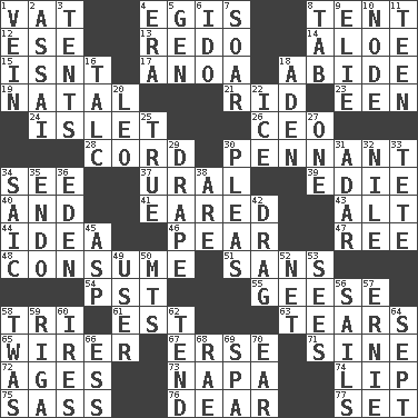ACROSS 1. Large container 4. The front part of a cuirass 8. Portable shelter 12. Compass dir. 13. Do over again 14. _ vera 15. Is not 17. Small Philippine buffalo 18. Stay 19. Brizilian seaport 21. To free from 23. Car or cant ending 24. Small island 26. Corporate head (abbr.) 28. Drawstring 30. Pre-World Series prize 34. Observe 37. Mountain range 39. Singer Brickell 40. Also 41. Having ears or earlike features 43. Keyboard modifier key 44. The main thing one is thinking about 46. Lightbulb-shaped fruit 47. To riddle 48. Eat 51. Without 54. Pacific Standard Time (abbr.) 55. Honkers 58. Three (prefix) 61. Eastern Standard Time (abbr.) 63. Rends 65. One who wires 67. Celtic language 71. Trig term 72. Ripens 73. California wine valley 74. Mouth edge 75. Backtalk 76. Letter starter 77. Put into a specified state DOWN 1. Distinctive style or manner 2. Slender Brazilian palm 3. Portable shelters 4. Period 5. Commissioned mil. rank 6. Wedding promise 7. Fly high 8. Bar bill 9. Writer Wiesel 10. Connecting point 11. Adolescent 16. Baby powder 18. An important port of Yemen 20. Lion 22. Frozen water 25. Loyal 27. Single 29. Window treatment 30. Entreaties 31. The sixth month of the Jewish calendar 32. Mediterranean tributary 33. Wig 34. Ketch in the Levant 35. Inside; within (prefix) 36. Locale of original sin 38. "We ___ not amused" (Victoria) 42. To be drawn or hauled along 45. Cleo's killer 49. One who makes use of a thing 50. Mountains (abbr.) 52. Fish or hair follower 53. Perceives with the eye 56. Moves on water 57. Bert's buddy 58. It was, poetically 59. Port city in Latvia 60. Angers 62. Watch over 64. Back-to-school mo. 66. Curvy letter 68. Actress Charlotte 69. Health resort 70. Hearing organ