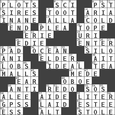 ACROSS 1. Small pieces of grounds 6. _-fi 9. Pacific Standard Time (abbr.) 12. Founders of families 13. A blast of a horn 14. Roberta Peters solo 15. Lacking in sense or substance 16. Silent film actress Nazimova 17. Having a low temperature 18. Conclusion 19. Entreaty 20. Drink excessively 21. One of the Great Lakes 23. RI univ. 24. Singer Brickell 25. Keyboard key 28. Groovy apt. 30. Sea 34. Grain storage tower 35. Cuckoo 36. A person who is older than you are 38. Small island 39. Tennis shots 41. Perfect 43. Beverage made from leaves 44. Promenades 46. Ancient Persian 48. Hearing organ 49. Mitch Miller's instrument 50. Against 51. Make new 53. Mayday 56. Toward shelter 57. Assistant 58. 61 cubic inches 60. Global Positioning Systems (abbr.) 61. Put down 62. First name in cosmetics 63. Curvy letter 64. Keyboard modifier key 65. Took without asking DOWN 1. 23rd letter of the Greek alphabet 2. Actor's bit 3. Northwest Algerian city 4. Looked after 5. Compass dir. 6. Flatfish 7. Root beer relative 8. Call ___ day 9. Conciliate 10. Drop; flow; fall 11. Small amount or degree 13. Story 14. Oak nuts 19. Part 20. Third day of the wk. 22. River (Sp.) 24. The property of being fit to eat 26. Writer Wiesel 27. Roll call or roster of names 28. Inside of hand 29. Small Philippine buffalo 31. Biblical high priest 32. Say or write further 33. Born 37. Role for Stallone 40. Chalkboards 42. Lion 45. _ Lanka 47. Cease 49. Wrote a lyric poem 50. High mountains 51. Monetary unit of Yemen 52. Prepare for publication 54. Von Bismarck 55. Stitch closed the eyes of (a falcon) 56. Grow older 57. Wing 58. French article 59. To sift