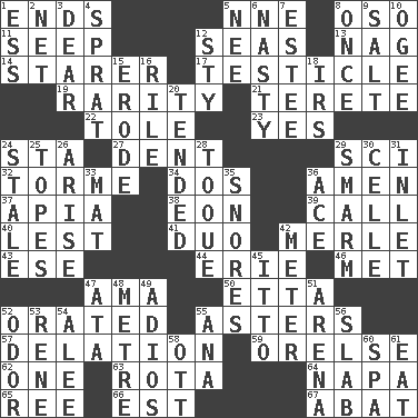 ACROSS 1. Conclusions 5. Compass dir. 8. Bear (Spanish) 11. Ooze 12. Oceans 13. Tired old horse 14. A viewer who gazes fixedly 17. A testis 19. Noteworthy scarcity 21. Cylindrical with tapered ends 22. Lacquered or enameled metalware 23. Consenting reply 24. R.R. building 27. Scratch 29. _-fi 32. Singer Mel 34. Two (Sp.) 36. So be it 37. Capital of Western Samoa 38. Age 39. Give a ring to 40. For fear that 41. Superhero pair 42. Haggard of country music 43. Compass dir. 44. One of the Great Lakes 46. Was introduced to 47. Wet nurse (var.) 50. Singer James 52. Spoke pompously 55. Michaelmas daisies 57. Accusation by an informer 59. Threatening words 62. Single 63. Roll call or roster of names 64. California wine valley 65. Portuguese money of account (variant) 66. Eastern Standard Time (abbr.) 67. Blind as ____ DOWN 1. Curvy letter 2. Fish or hair follower 3. Letter starter 4. Small fatty European fish 5. Born 6. Thoroughly unpleasant 7. First name in cosmetics 8. Single time 9. Table seasoning 10. Double curve, resembling the letter S 12. Filthy place 15. Eat (away) 16. Cause heat under the collar 18. Big collection agency 20. Looked after 24. Showing deterioration from age 25. Drinks excessively 26. Get up 28. Woman's close-fitting hat 29. Excessive but superficial compliments 30. Cell (Danish) 31. An arm off of a larger body of water 33. Floor protector 35. Sounds asleep 36. Adept person 42. Distance measurement 45. "Tell ____ the Marines!" 47. "One Day ___ Time" 48. Distance measurement (Brit.) 49. Goodbye (Sp.) 51. Sports stadium 52. Scent 53. French philosopher Descartes 54. Toward shelter 55. Santa ___, CA 56. Broad, flat, thick piece 58. Baseball player Mel 60. Health resort 61. Consume